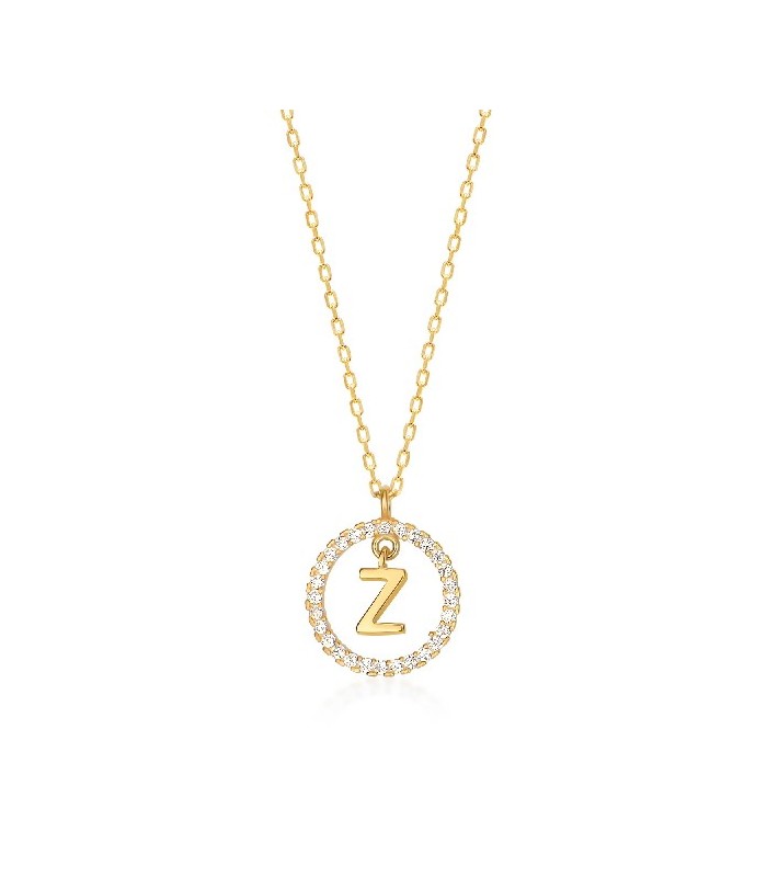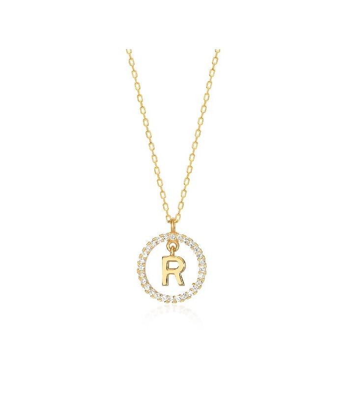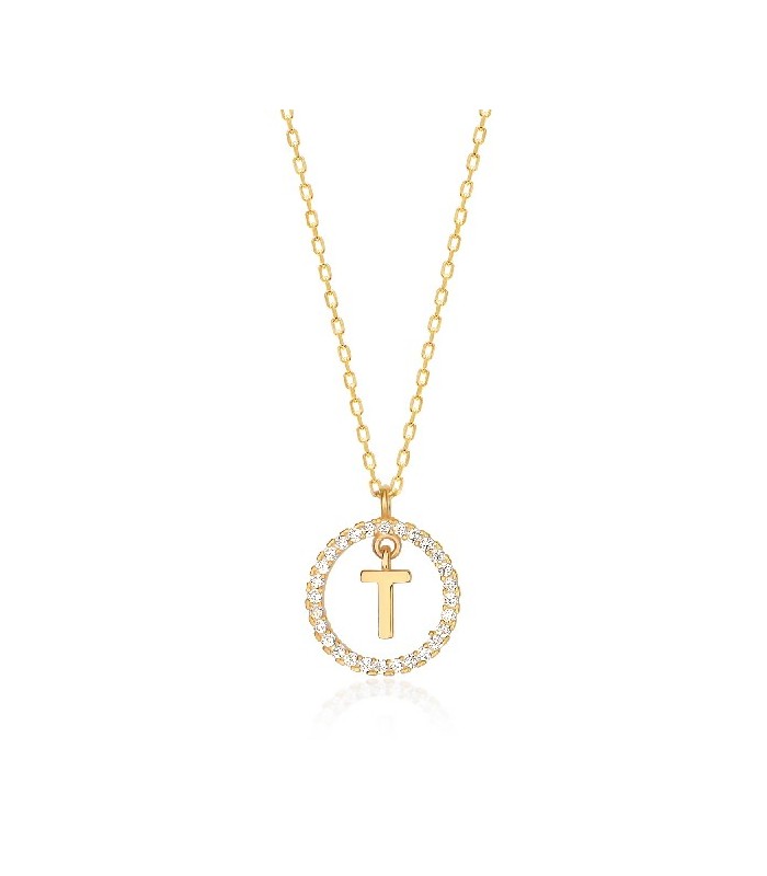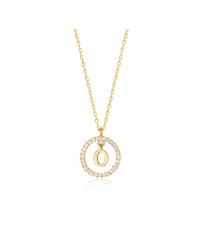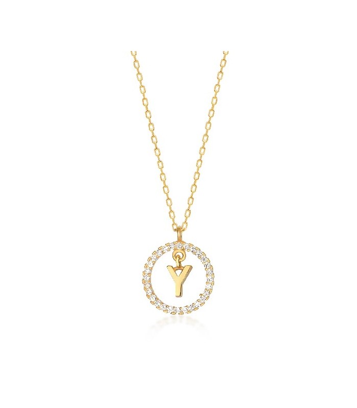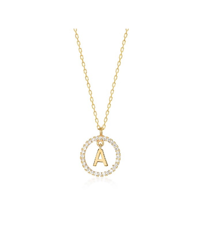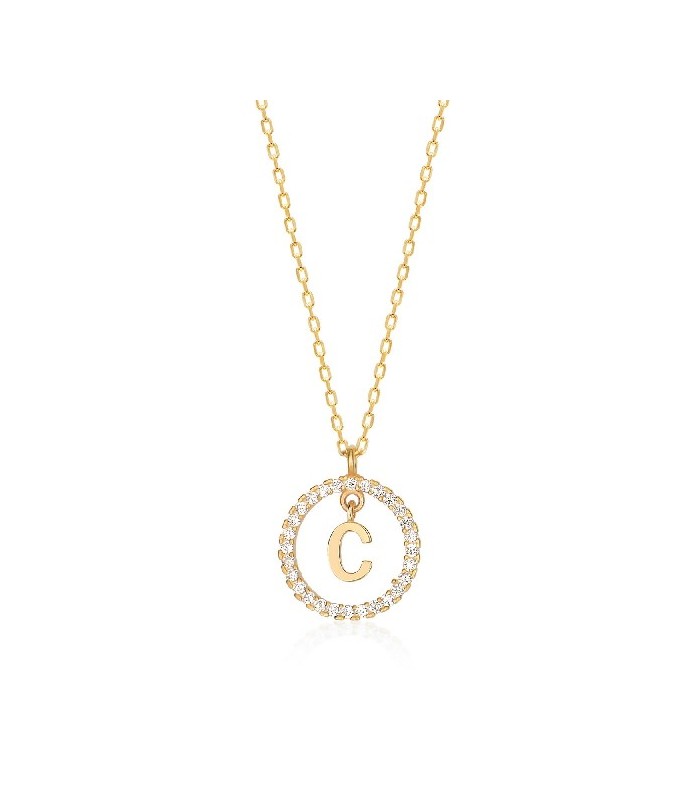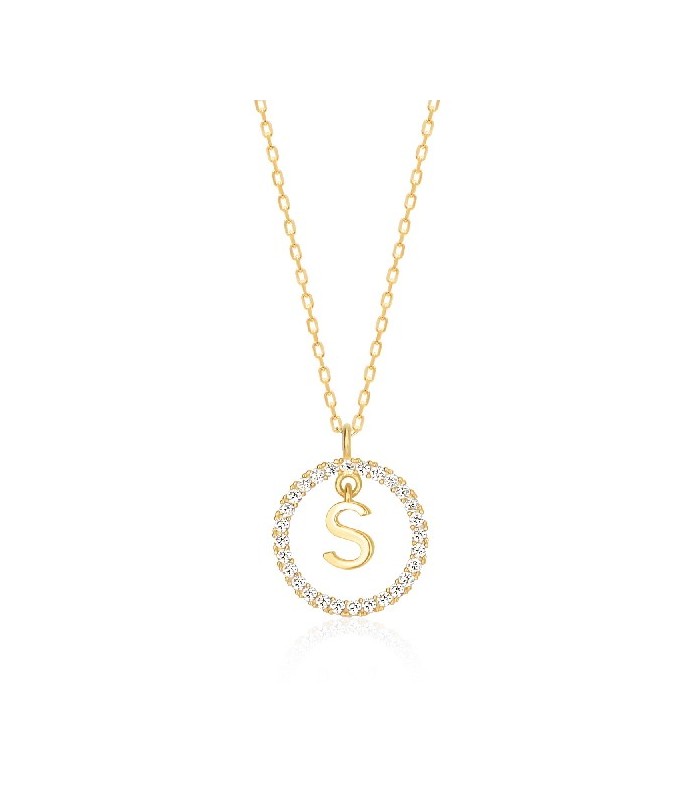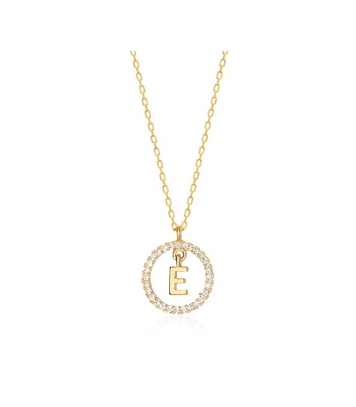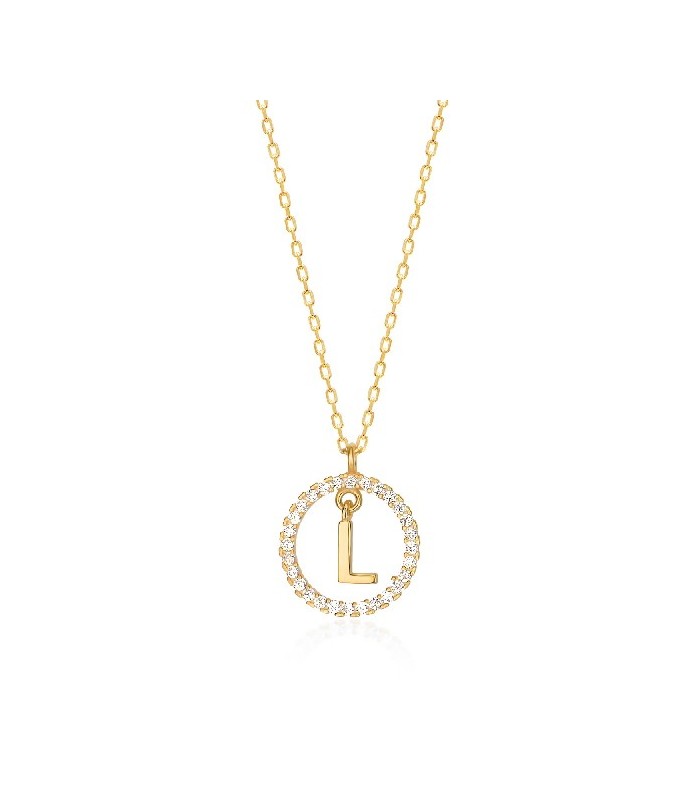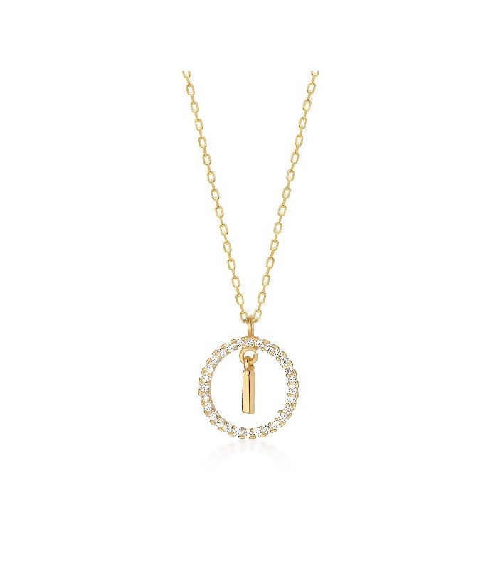 Collar en plata de ley con baño de oro de 18k de 40cm ampliable hasta 47cm con colgante circulo con circonitas y en el interior inicial de plata
