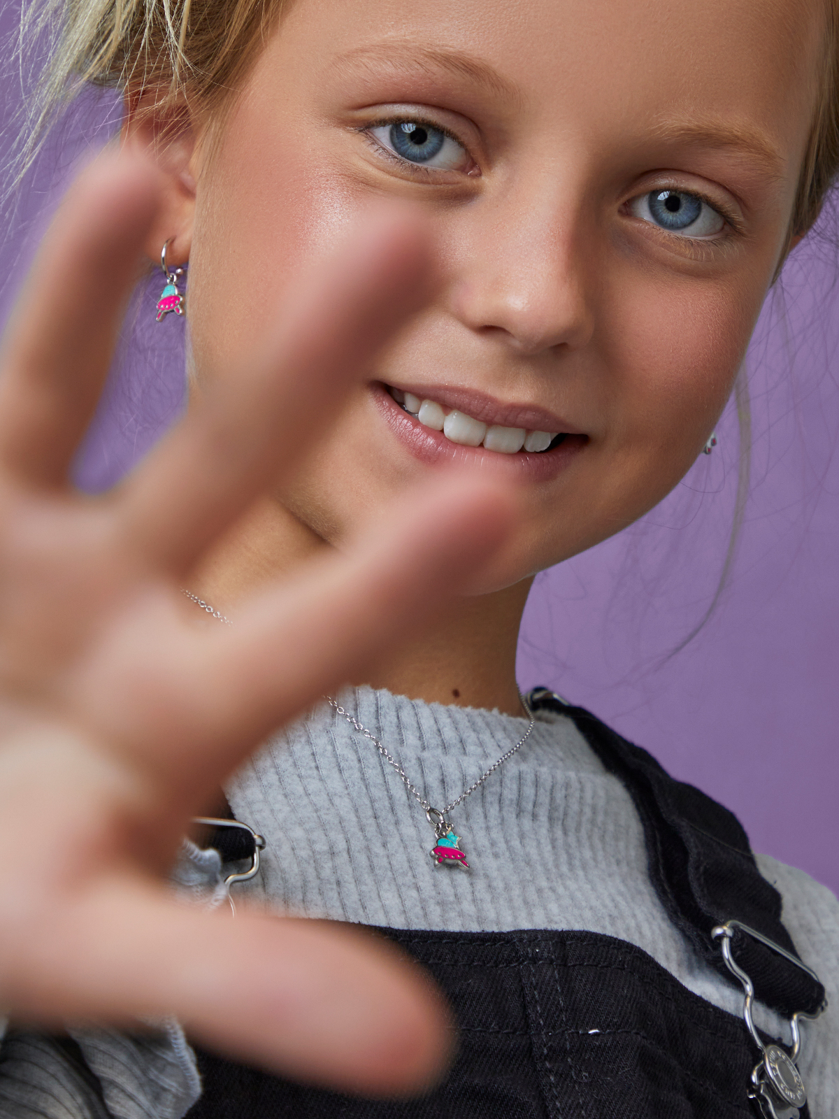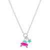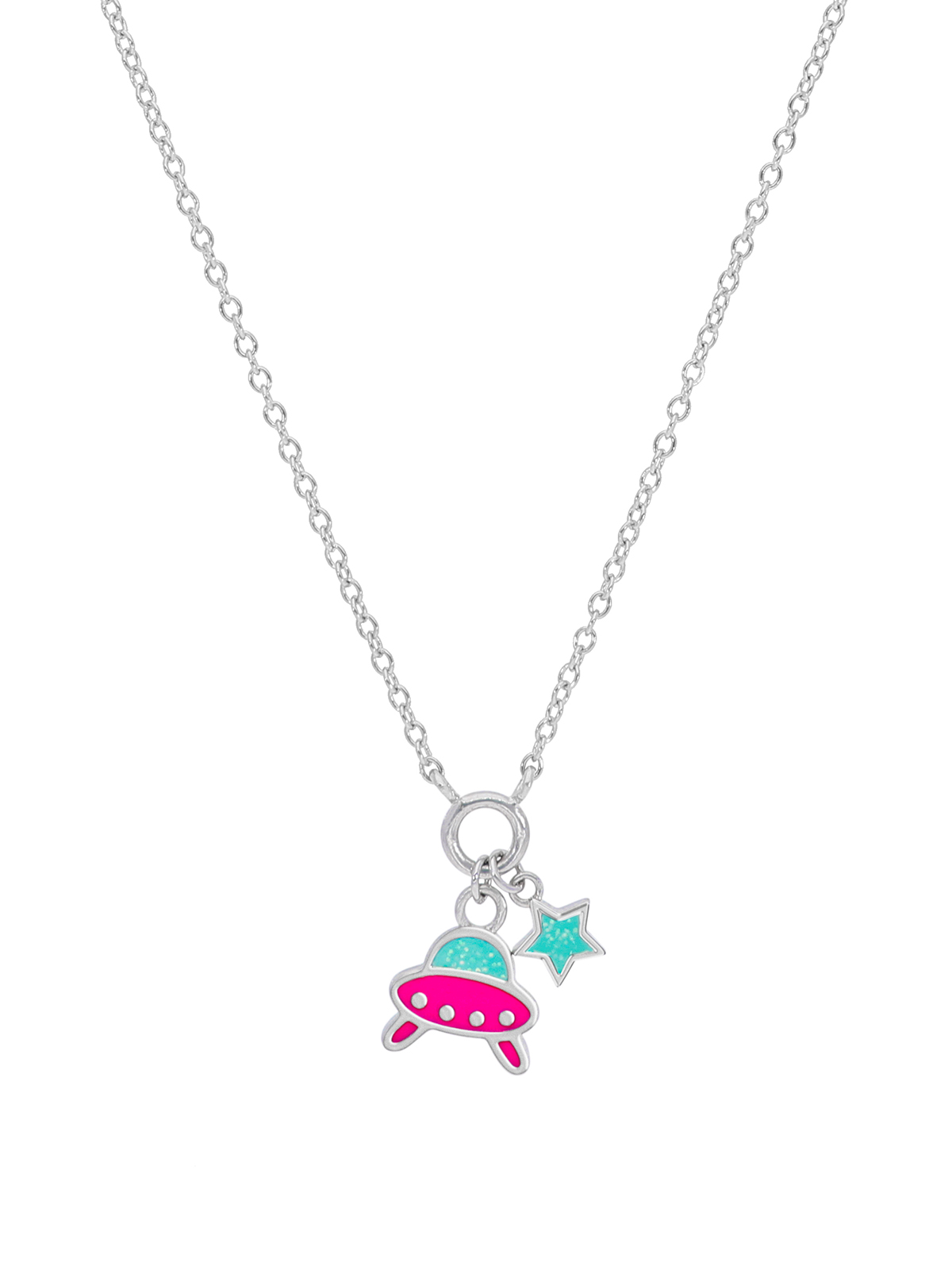Collar nave espacial. Plata de 1ª Ley rodiada. Esmalte fucsia y turquesa. Detalles con purpurina. Cierre rehasa. Cadena adaptable. Colección girls.