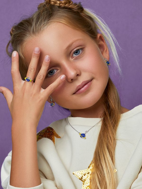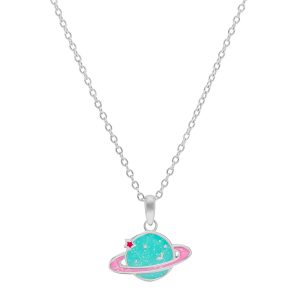 Collar planeta con circonita. Plata de 1ª Ley rodiada. Esmalte azul noche y amarillo fluor. Detalles con purpurina. Cierre rehasa. Cadena adaptable. Colección girls.