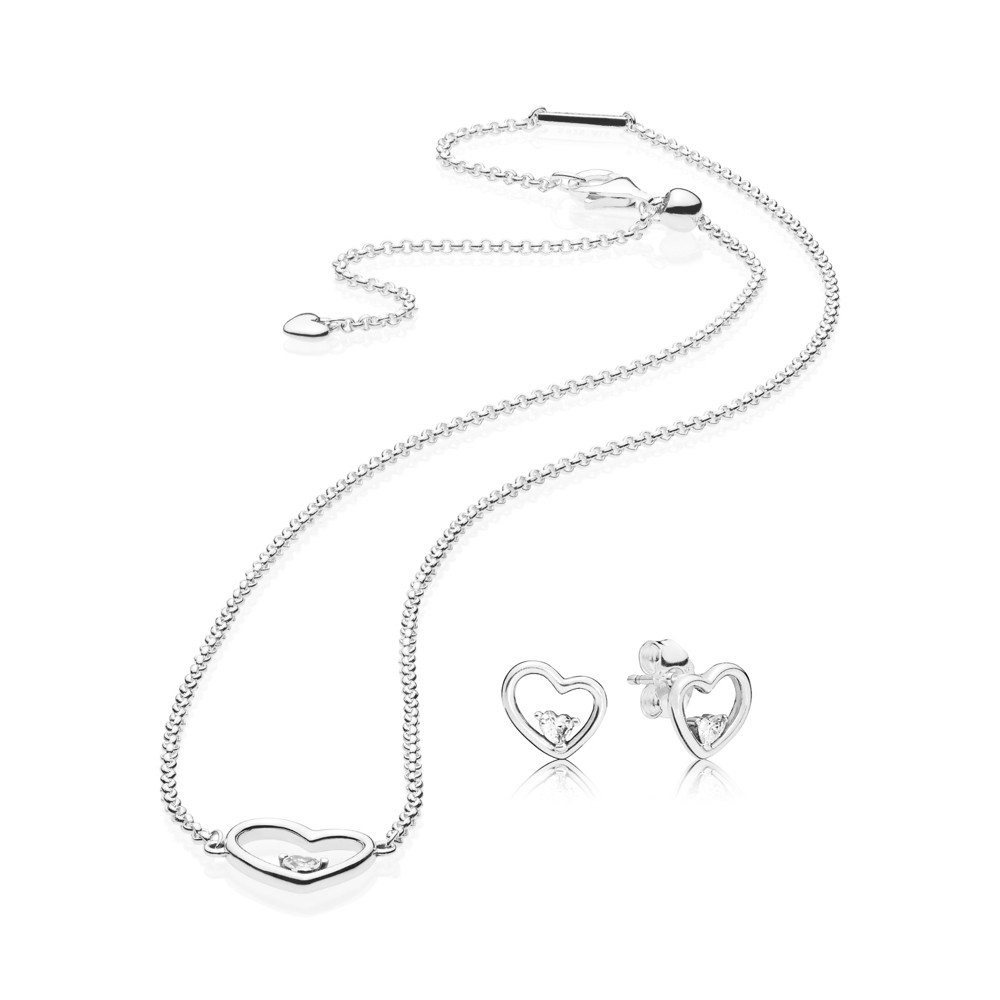 Conjunto en plata de ley formado collar y pendientes a juego Corazones de Amor Asimétricos. Ambos adornados con circonitas cúbicas transparentes. El collar tiene una cadena de 54 cm de largo.