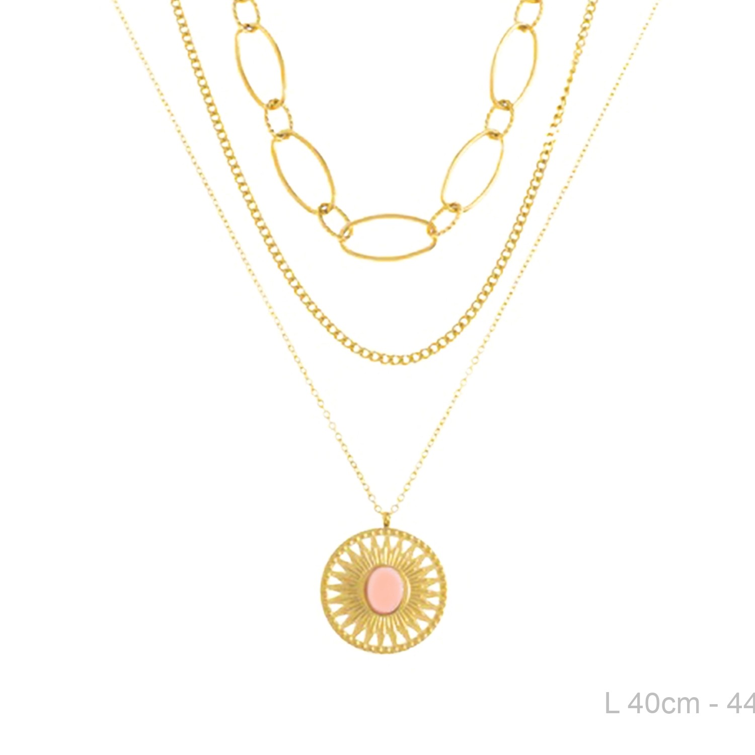 Gargantilla en acero dorado triple con cadena de eslabones, cadena y cadena con medallón colgante sol y piedra en tono rosa