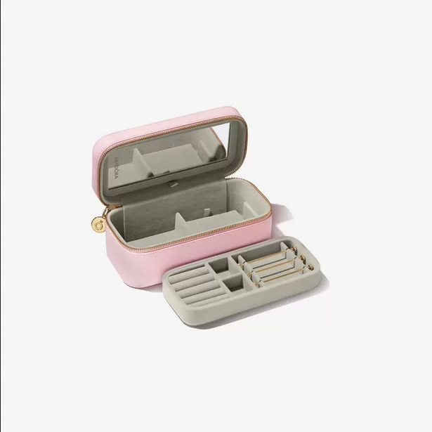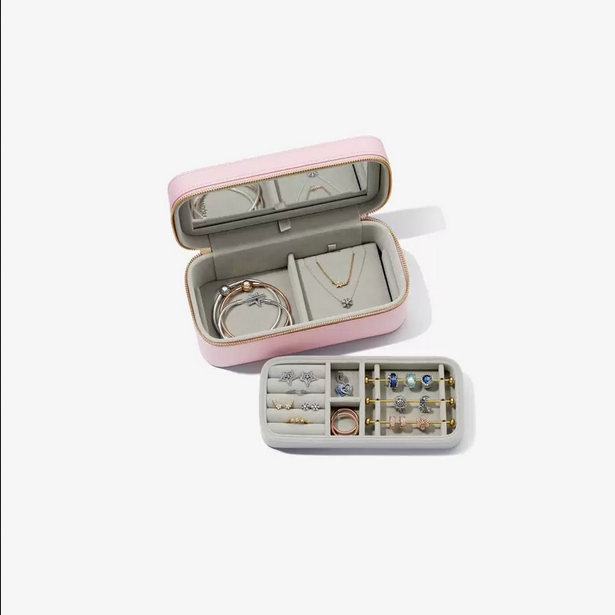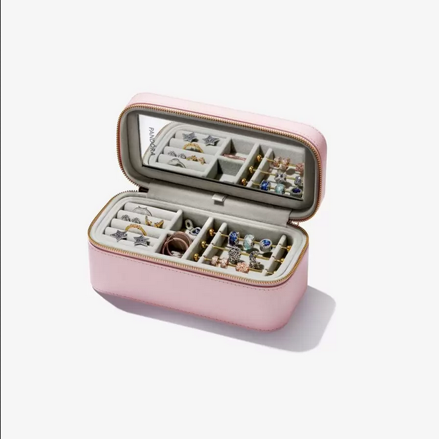 Te presentamos el lugar perfecto para guardar tus joyas de Pandora: creado para organizar y proteger tus joyas favoritas, y para mantenerlas seguras. Nuestro joyero cuidadosamente diseñado tiene un exterior de PU con textura y compartimentos separados y forrados de terciopelo en el interior para almacenar diferentes tipos de joyas. El joyero posee una bandeja superior desmontable para tus charms, anillos y pendientes, una pieza plana para collares y un compartimiento debajo para pulseras. Dos anillas en forma de D en la cremallera te permiten cerrar el joyero y el espejo que hay en el interior de la tapa te resultará útil para mirarte mientras creas tu look todos los días. El lugar perfecto para atesorar tus piezas más queridas o un complemento excelente para un regalo brillante. No se incluyen las joyas que aparecen en la imagen.