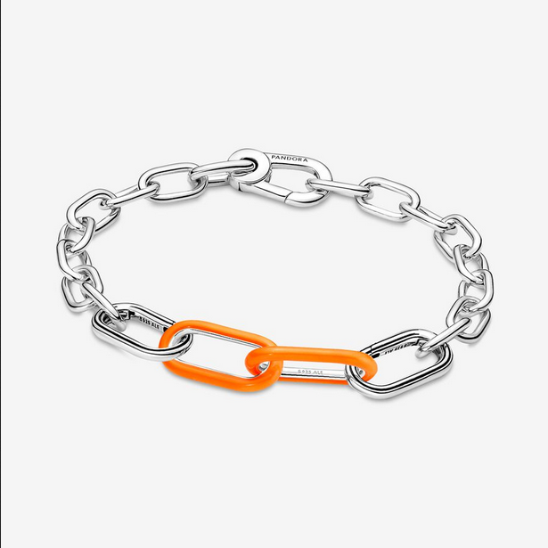 Dale un toque de color a tus looks y un tono atrevido a tus cadenas de eslabones con este Link Doble Naranja Brillante Pandora ME. Formado por dos links entrelazados envueltos en brillante esmalte de color naranja, este link doble brilla bajo luz ultravioleta. El interior de cada link es de plata de primera ley pulida para proteger el esmalte contra arañazos. Lleva el tuyo entre conectores decorativos en tus collares o pulseras de cadena de eslabones de Pandora ME o cuélgalo en unos pendientes de aro para hacer una declaración de estilo única. Consejo de estilo: un link tiene la misma longitud que un link doble o cuatro links pequeños, lo que ofrece infinitas posibilidades de estilo. *Recuerda: Las joyas de Pandora ME sólo son compatibles con la colección Pandora ME.