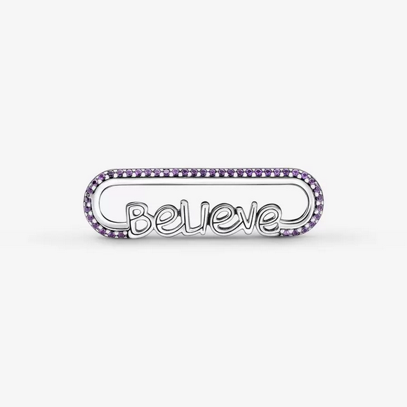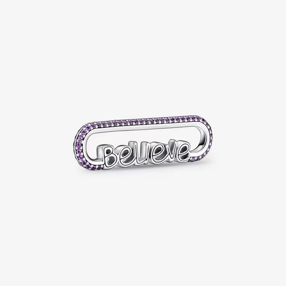 Link Palabra Believe Pandora ME. Acabado a mano en plata de primera ley y embellecido con pavé brillante de color púrpura, este link se presenta con la palabra «believe» (Creer) en una fuente que imita la escritura a mano como recordatorio diario de la esperanza y la perseverancia. Crea tu propia joya agregando este link de palabra entre conectores en tus pulseras de cadena de eslabones, collares o pendientes. Consejo de estilo: un link de palabra tiene la misma longitud que un link doble o cuatro links pequeños, lo que ofrece infinitas combinaciones diferentes. Si quieres personalizarlo aún más, puedes añadirle cualquier medallón con cierre de click. ¡Tienes infinitas posibilidades! *Recuerda las joyas de Pandora Me solo son compatibles con la Colección de Pandora ME.