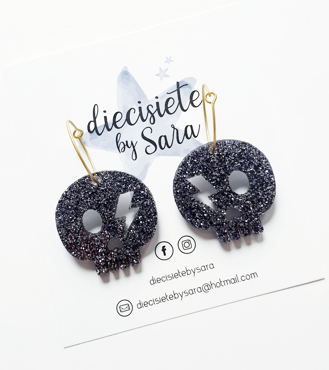 Pendientes con arito de 2 cm en latón con bao de oro y calavera en negro glitter