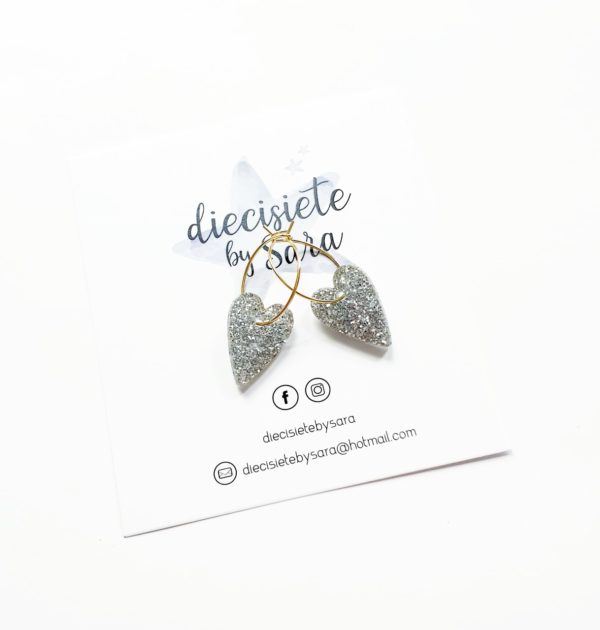 Pendientes aro con corazón plata glitter