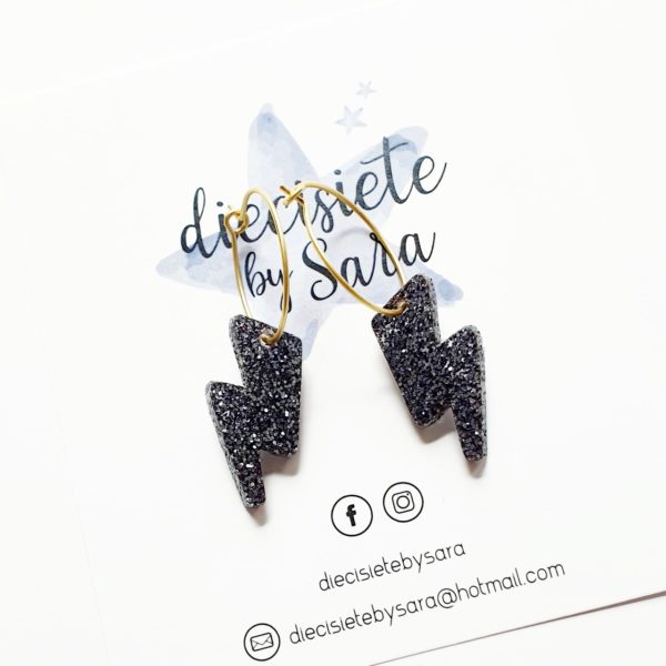 Pendientes con arito de 2 cm en latón con baño de oro y rayo en negro glitter