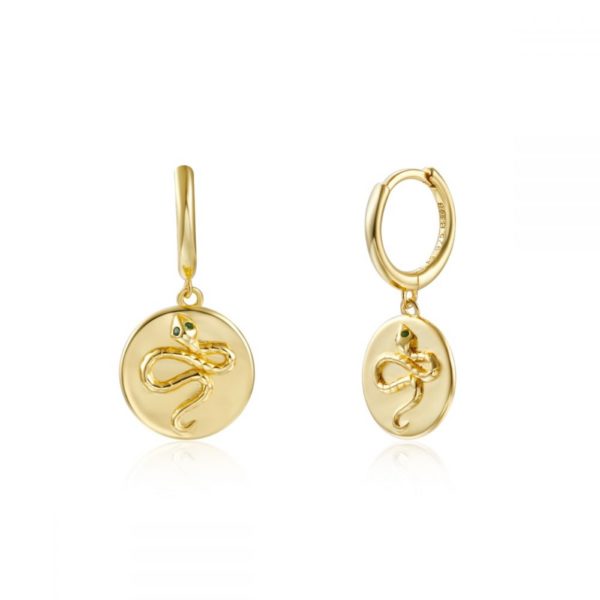Pendientes en plata de primera ley aro con baño de oro y colgante placa redonda con serpientes de ojos verdes