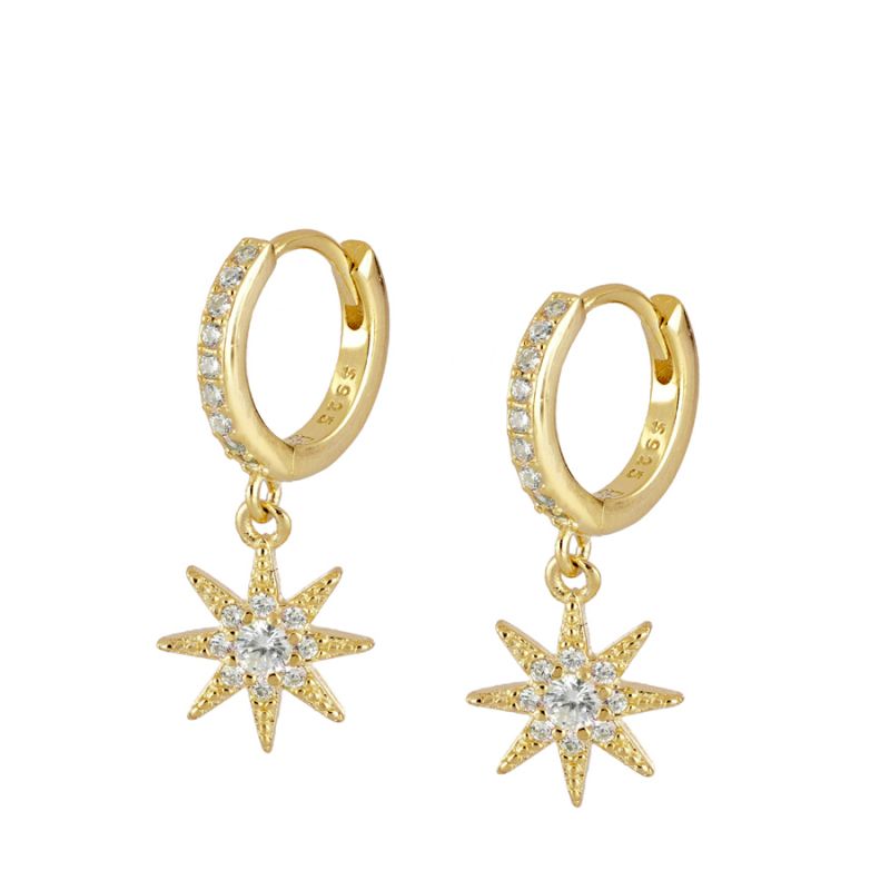 Pendientes en plata de ley con baño de oro de 18k aro de 11mm con circonitas transparentes y colgante estrella de 8mm con circonitas transparentes