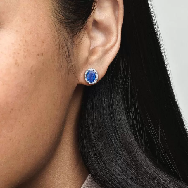 Los impresionantes cristales ovalados artificiales en color azul se presentan enmarcados por un halo de brillantes circonitas cúbicas transparentes que aportan a los pendientes el tono de la joyas tradicionales. Acabados a mano en plata de primera ley, la piedra principal se ha engastado en puntas para elevarla por encima del marco de pavé. Eleva tu look diario con estos llamativos pendientes o póntelos para hacer que las ocasiones especiales lo sean aún más.