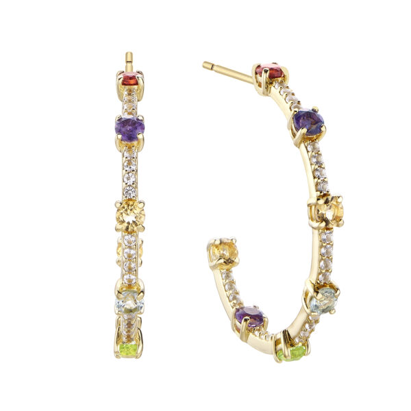 Pendientes Durán Exquse de la colección Melodía de Colores realizado en plata 925 con citrino, amatista, topacio azul y blanco, peridoto y granate bañado en oro amarillo 17 mm diametro