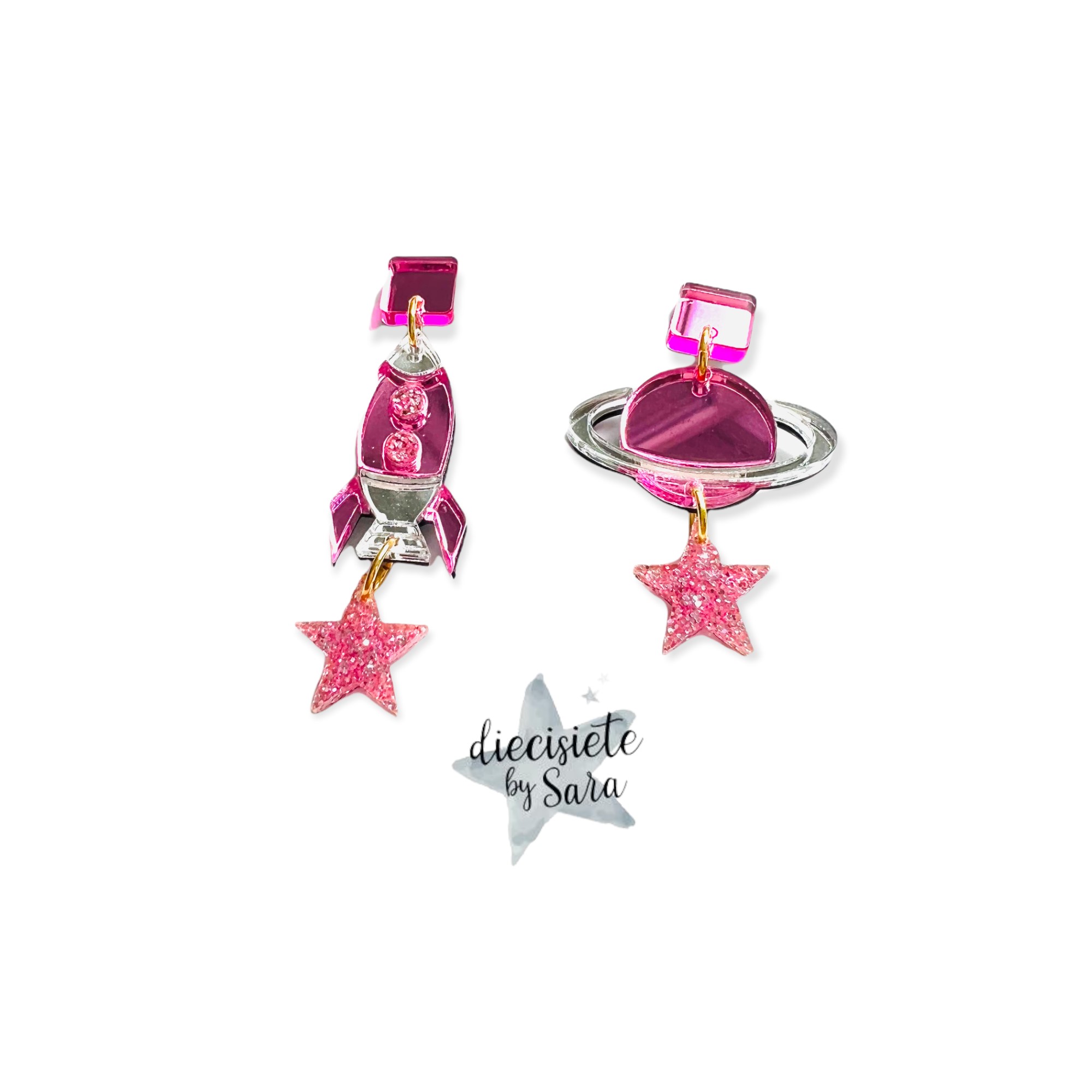 Conquista las estrellas con nuestros pendientes cohete y planeta en rosa espejo y estrellas en rosa glitter