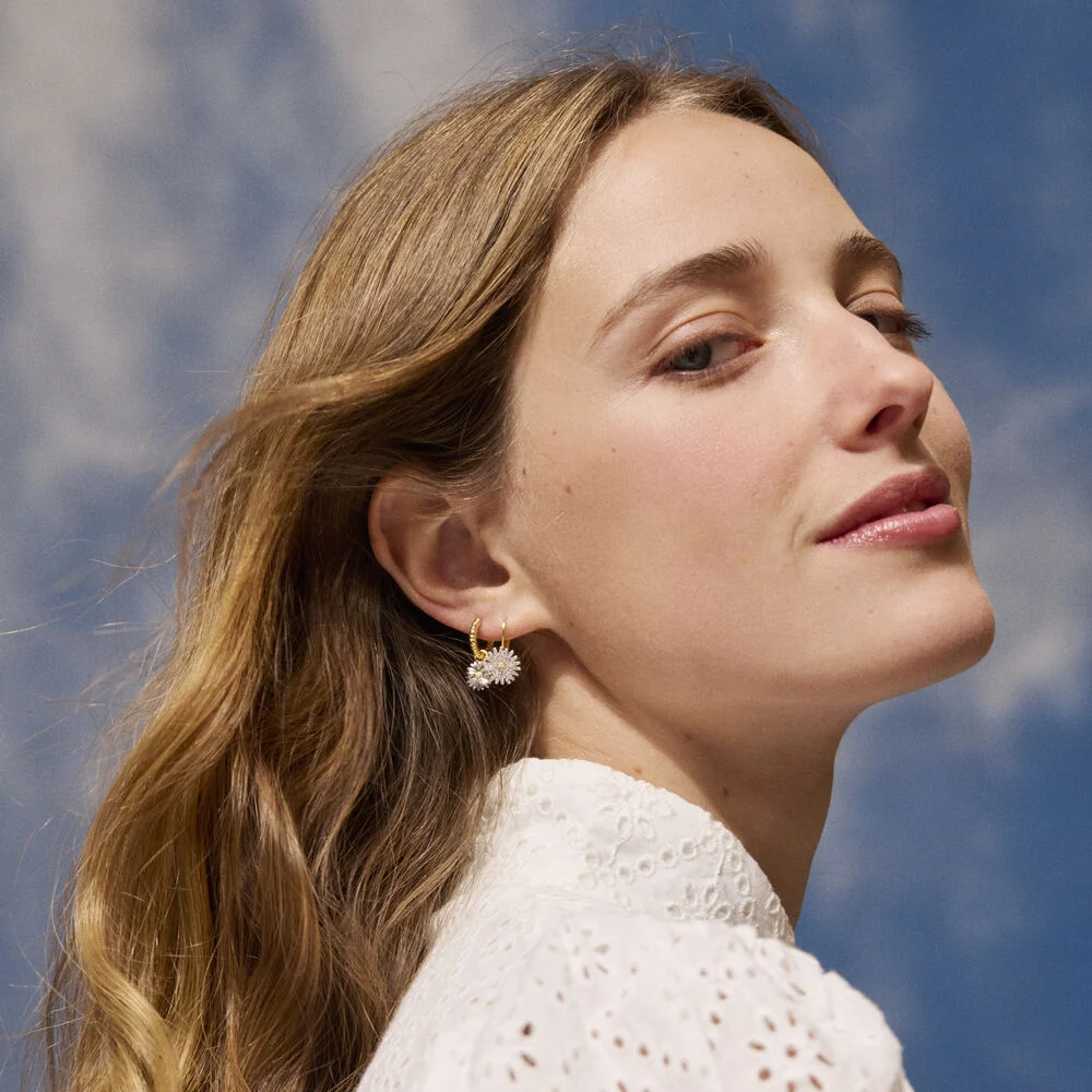 Pendientes de dormilona bicolores en forma de margarita con strass. Una opción súper primaveral que querrás lucir a todas horas.