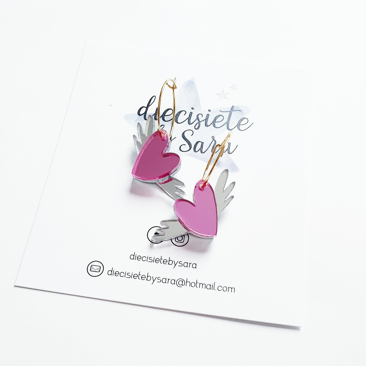 Aros dorados con baño de oro de 18k y corazón con alitas espejo