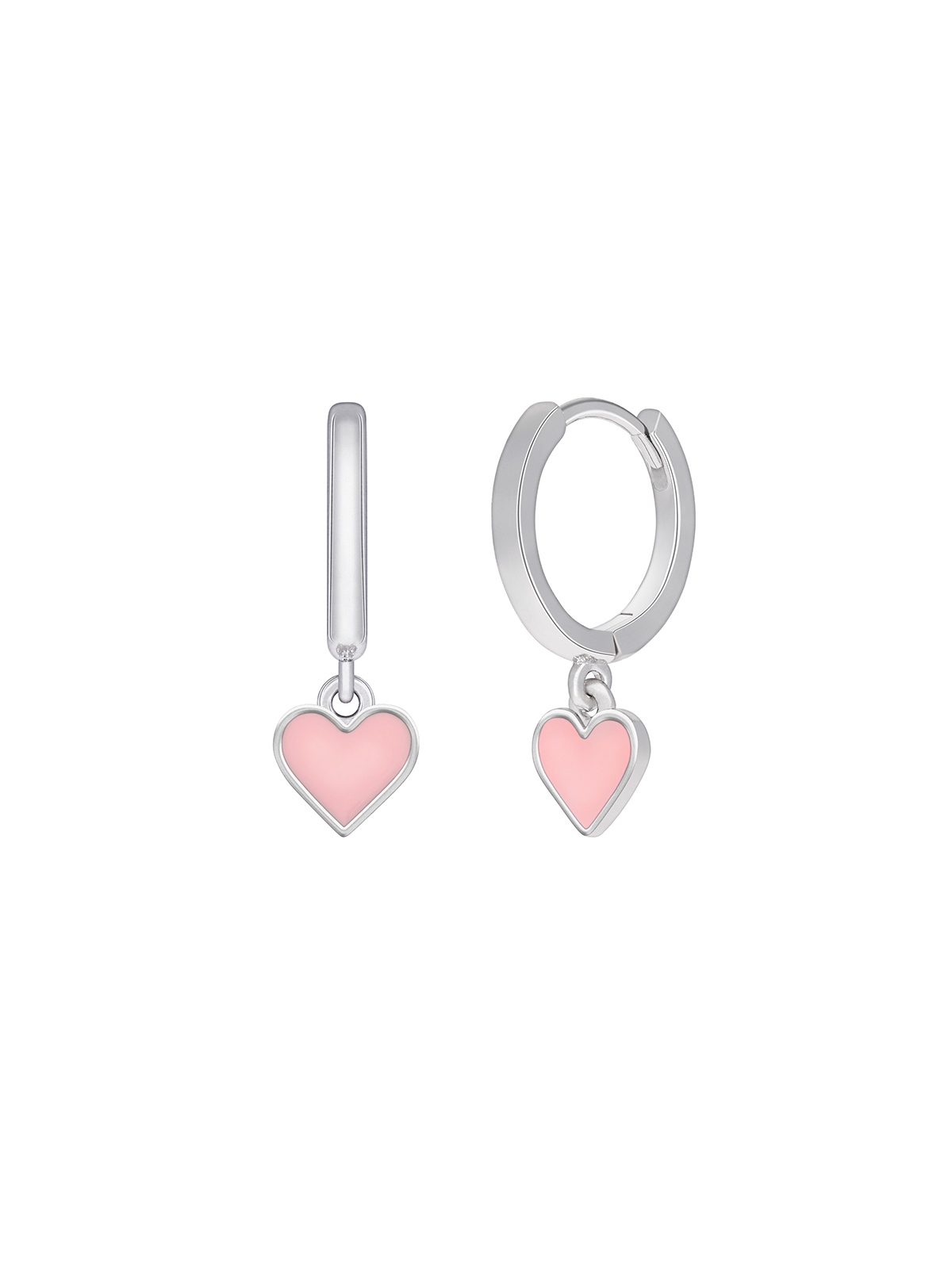 Pendiente hoop corazón. Plata de 1ª Ley rodiada. Esmalte rosa. Cierre huggy. Colección girls.