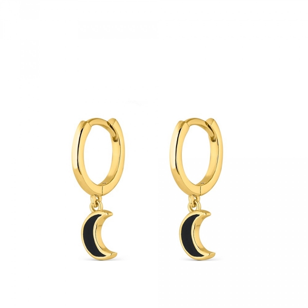 Pendientes Aro Plata de ley con baño de oro de 18k con colgante Luna de esmalte negro