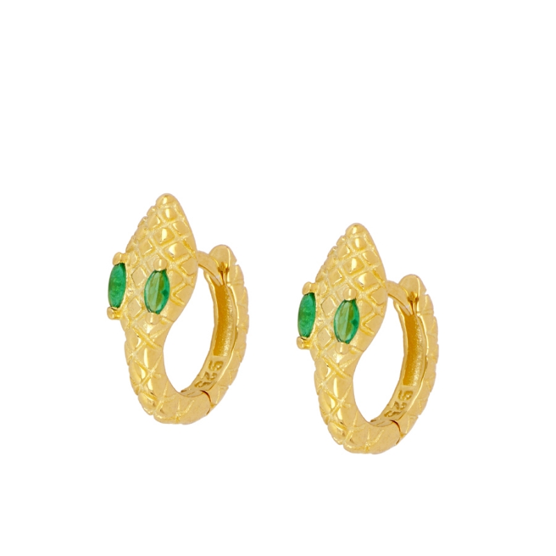 pendientes aro en plata de ley con baño de oro de 18k cabeza de serpiente con ojos en circonita verde