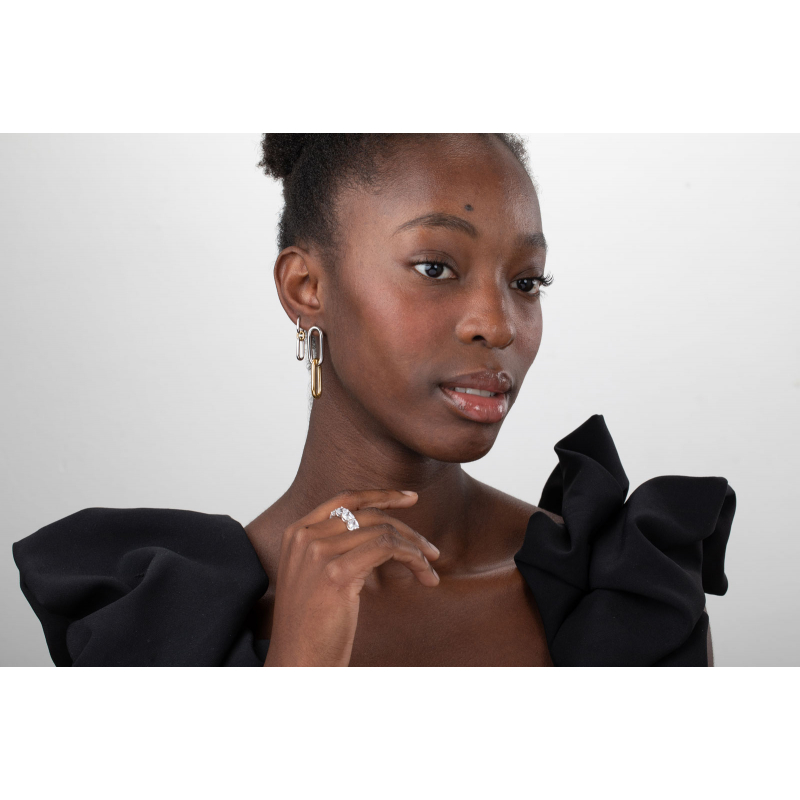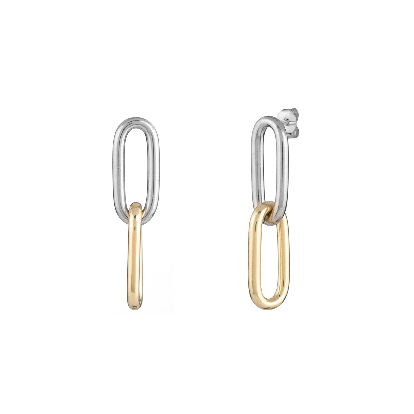 Par de pendientes en plata de ley doble eslabón, uno en tono plata y otro con baño de oro entrelazados y cierre de presión