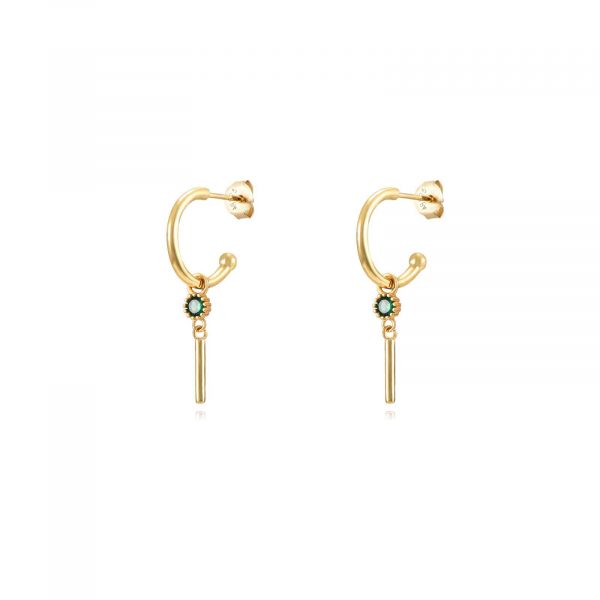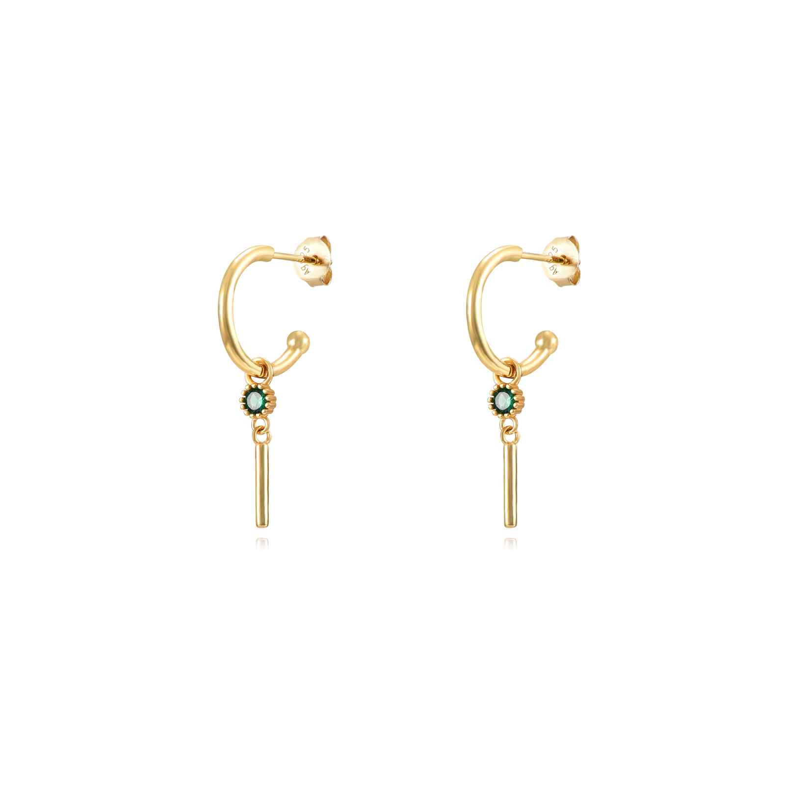 Pendientes en plata de ley con baño de oro de 18k semi aro con colgante circonita verde y palito