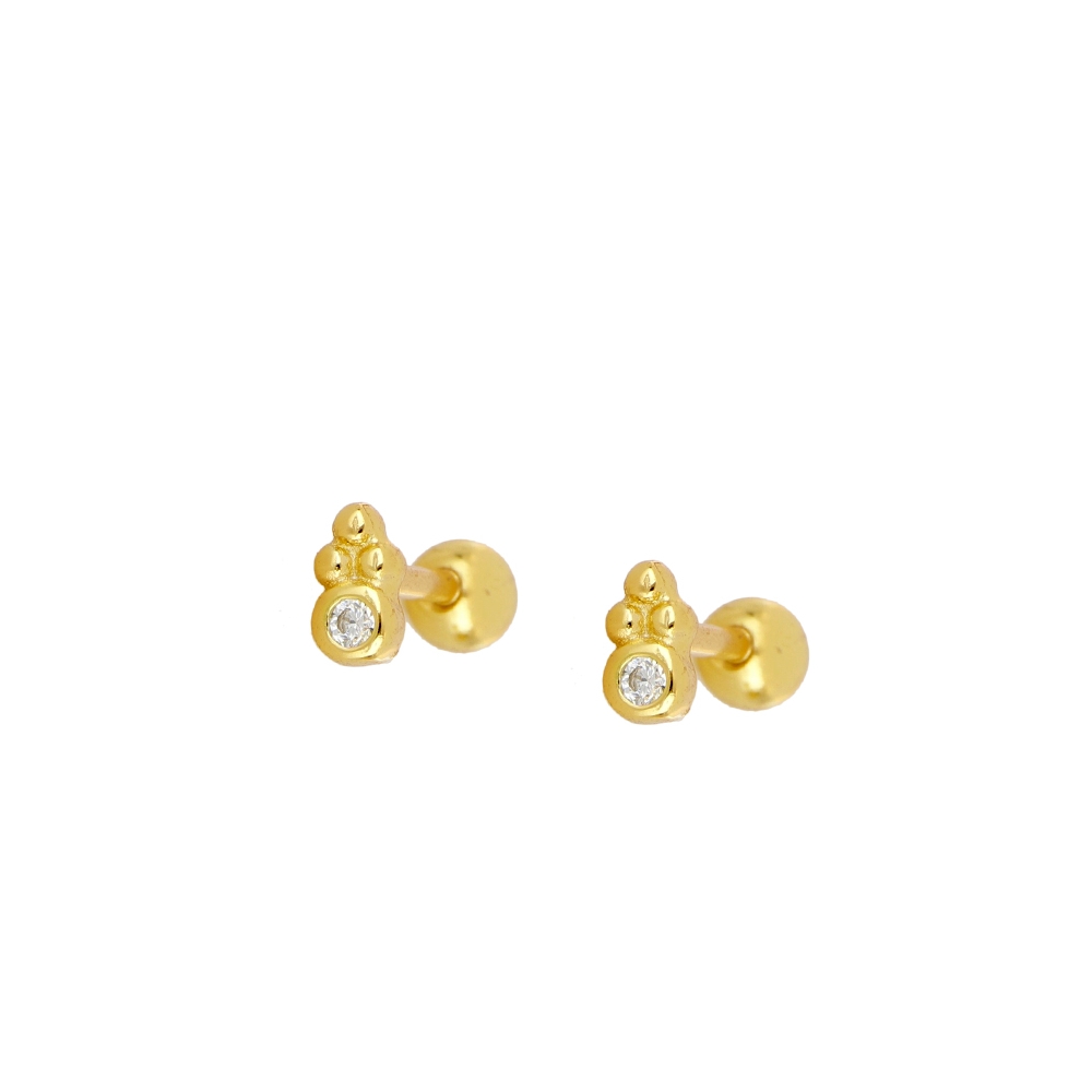 Pendiente tipo piercing en plata de primera leycon baño de oro 3 bolitas y circonita