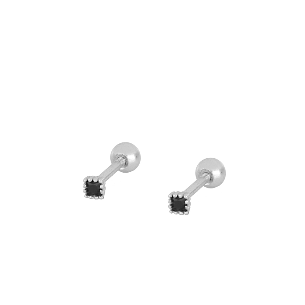 Pendiente disponible en plata de primera ley piercing cuadrado con circonita negra y cierre de bola roscada