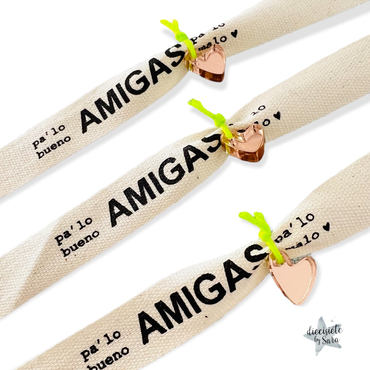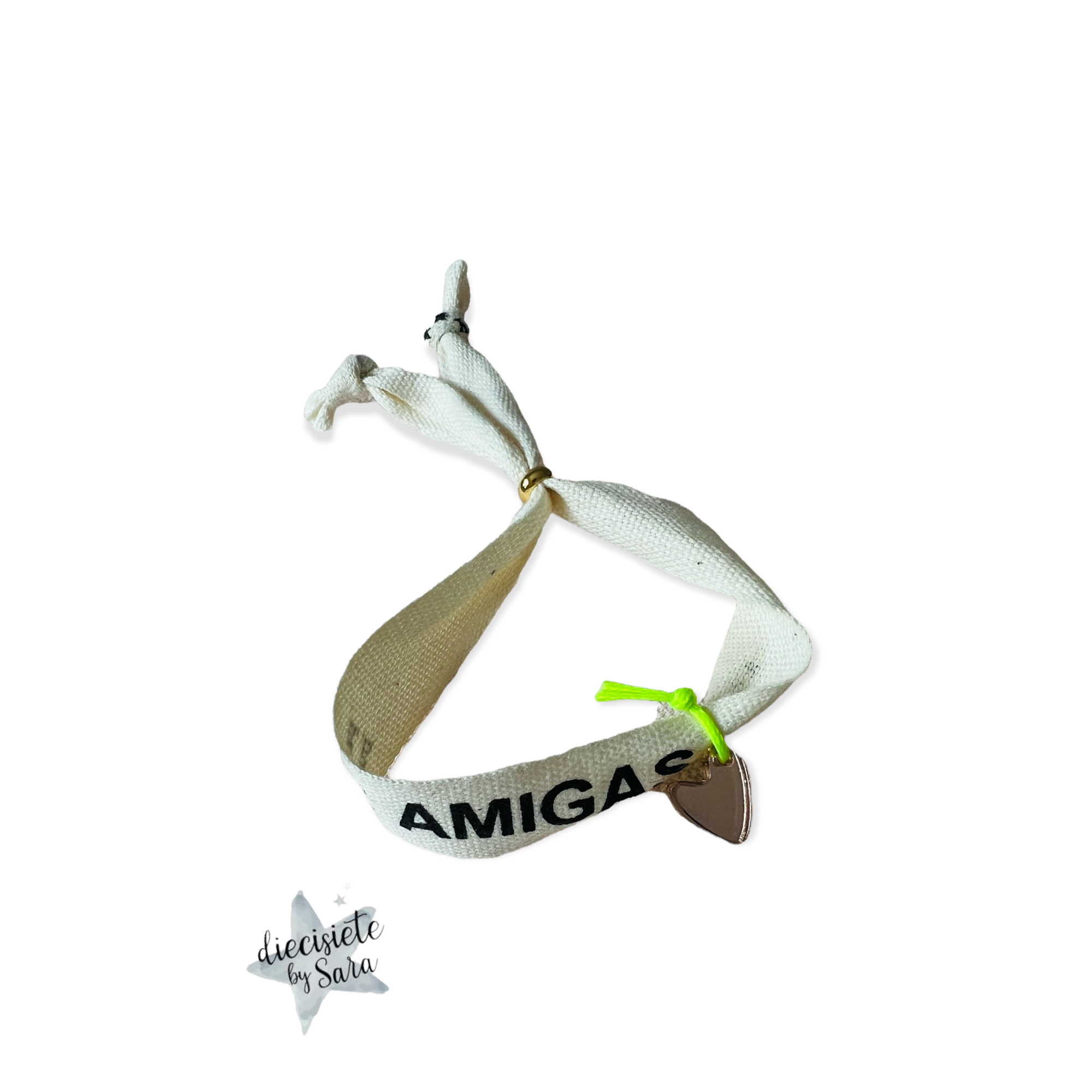 Pulsera en tela con grabado Amigas y motivo corazon en tono rose