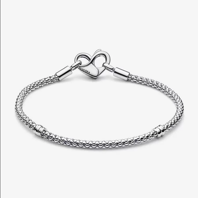 Actualiza tu colección con nuestro nueva Pulsera Cadena con Tachuelas de Pandora Moments. Acabada a mano en plata de primera ley, esta pulsera se presenta con una cadena flexible con textura y un cierre con forma de corazón que se puede abrir y el símbolo del infinito en su interior. Por favor, recuerda que esta pulsera admite hasta 14-18 charms.