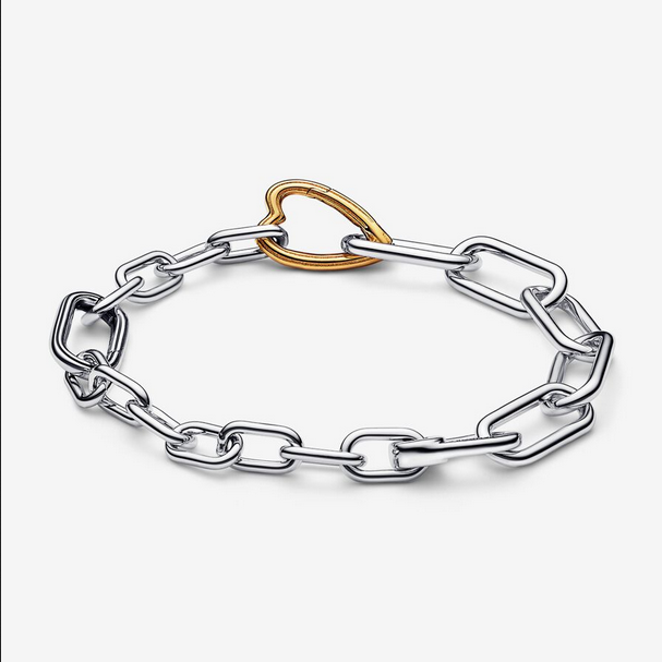 Lleva contigo más cosas que amas y lúcelas en nuestra Pulsera Link Corazón en Dos Tonos de Pandora ME. Una pulsera prediseñada que se presenta con una combinación de links grandes y pequeños de plata de primera ley, incluido un conector decorativo rectangular redondeado que se abre y un conector decorativo con forma de corazón alargado que se abre con recubrimiento de oro de segunda ley de 14k inspirado en el arco de Cupido. Personalízala cambiando los links y conectores decorativos. Una vez que hayas creado tu pulsera de links, embellécela con hasta ocho mini colgantes o dos medallones en el conector decorativo rectangular redondeado y hasta seis mini colgantes o tres medallones en el conector decorativo con forma de corazón para crear el look que tanto deseas. Por favor, recuerda: la pulsera debe abrirse usando el cierre de mosquetón y no los conectores decorativos. *Recuerda: Las joyas de Pandora ME sólo son compatibles con la colección Pandora ME.
