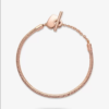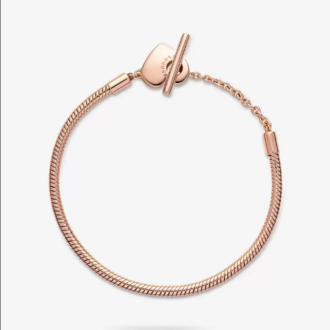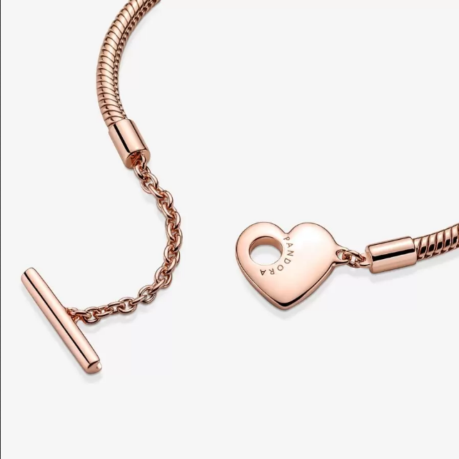 Incluye en tu look un toque en tonos cálidos con la Pulsera Pandora Moments Cadena de Serpiente con Cierre en T y Corazón . Acabada a mano con nuestra aleación única de metales con un recubrimiento electrolítico de oro rosa de segunda ley de 14K, esta joya es una interpretación moderna de la pulsera diseño cadena de serpiente de Pandora Moments. Se presenta con un cierre de doble círculo con barra en T. Para cerrarlo de forma segura debes pasar la barra en T a través del círculo más pequeño. Este elegante diseño le puedes añadir de 10 a 13 charms de Pandora Moments.