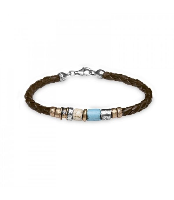 Pulsera en cuero marrón plata, bronce y pasta en blanco y turquesa