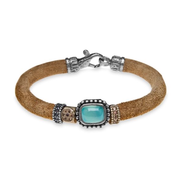 Pulsera en cuero color camel y plata de ley con piedra calcedonia, circonitas color champán y bronce y circonitas rosas