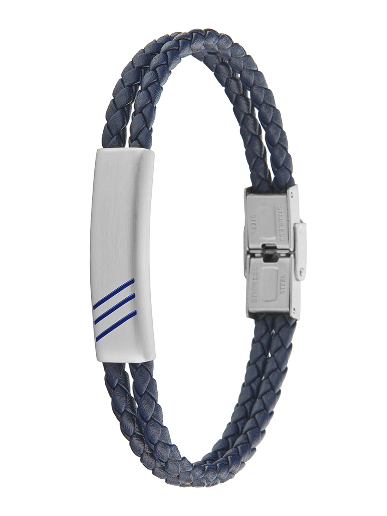 Pulsera cuero enazul, pieza en acero con detalles en azul y cierre desplegable
