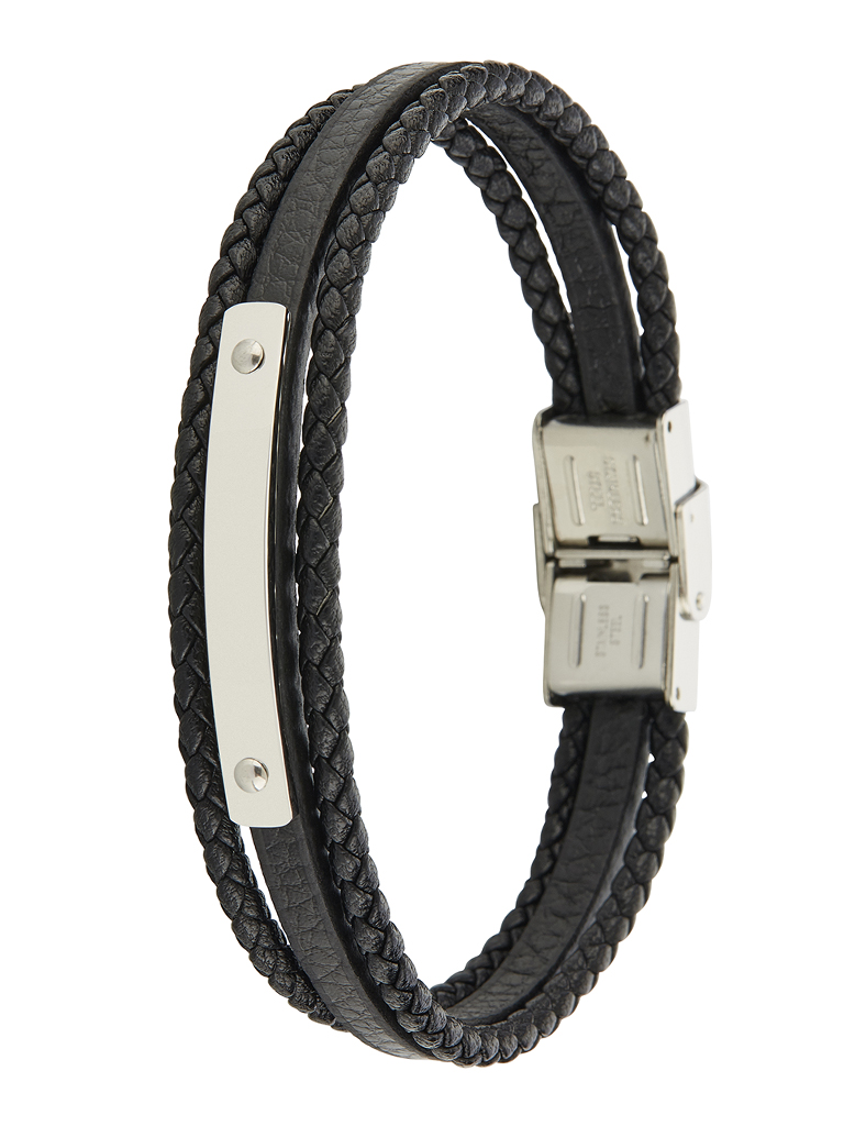 Pulsera de 3 cueros en negro con pieza en acero y cierre desplegable