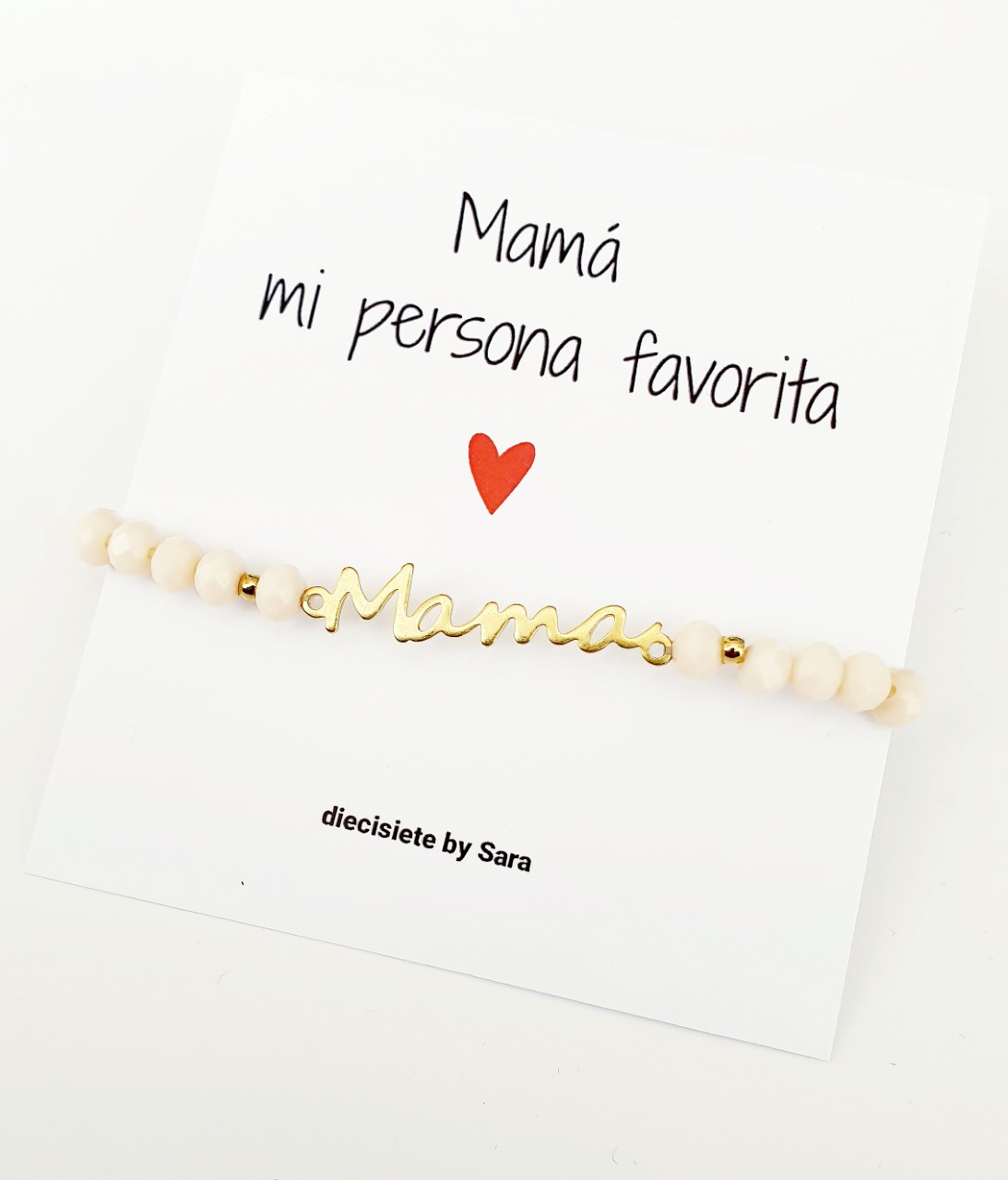 Pulsera piedras en rosa palo y palabra Mamá en metal dorado