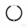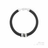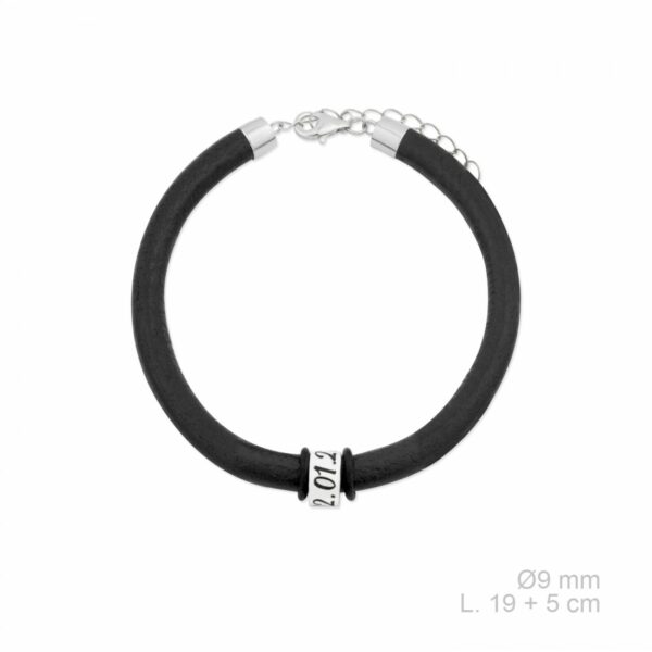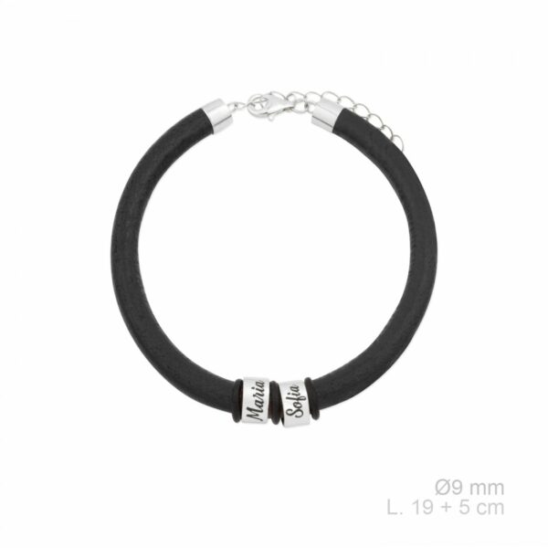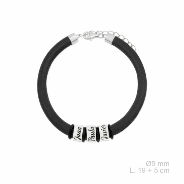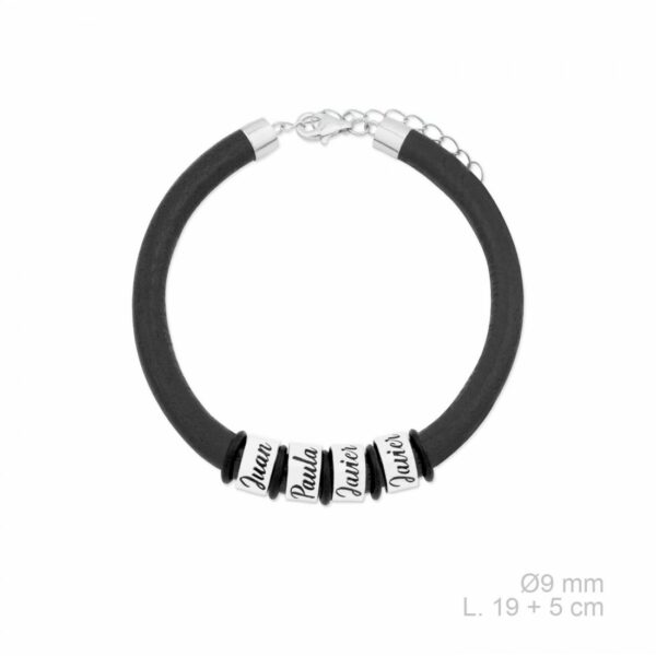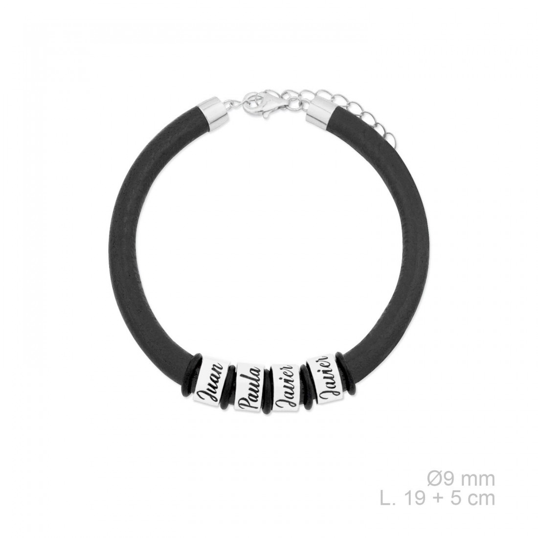 Pulsera en cuero con cierre de mosquetón en plata de ley y piezas de plata con el nombre o palabra favorita.