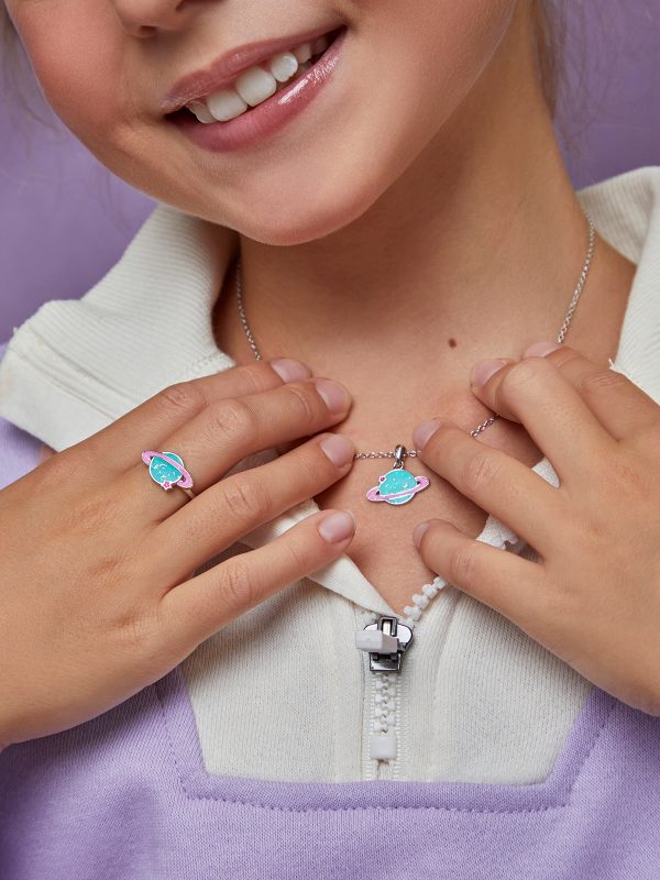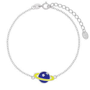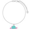 Pulsera planeta. Plata de 1ª Ley rodiada. Esmalte turquesa y rosa. Detalles con purpurina. Cierre rehasa. Cadena adaptable. Colección girls.