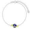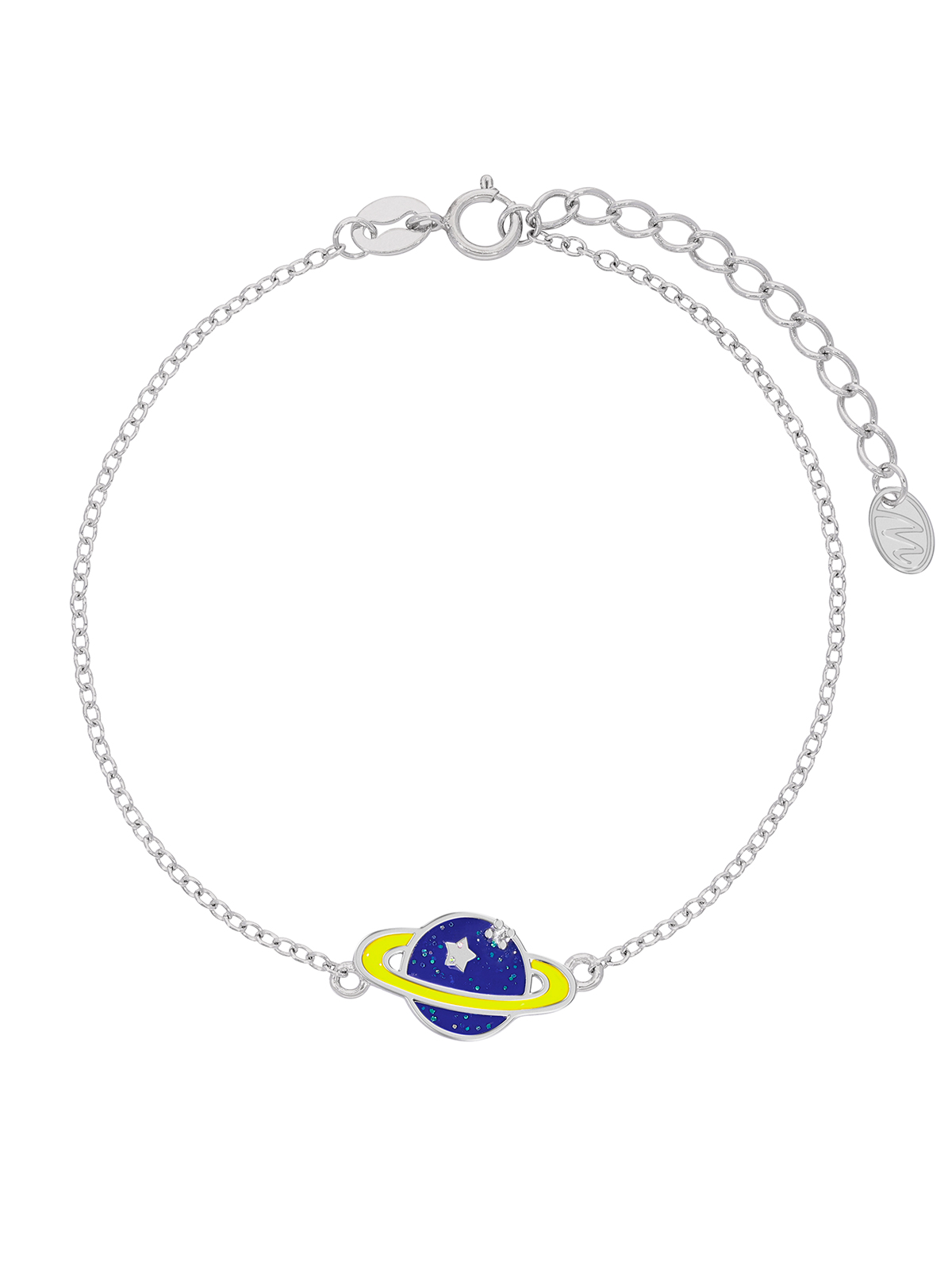 Pulsera planeta con circonita. Plata de 1ª Ley rodiada. Esmalte azul noche y amarillo fluor. Detalles con purpurina. Cierre rehasa. Cadena adaptable. Colección girls.