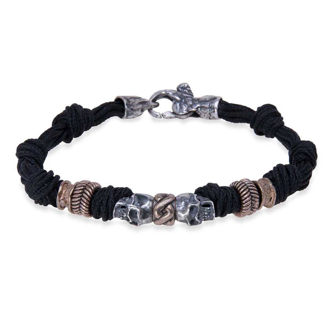 Pulsera en plata de ley con nylon en color negro piezas de bronce y plata Cierre de mosqueton en plata de ley