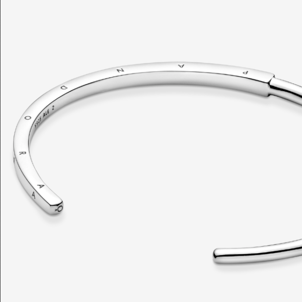 Pulsera Rígida Pandora Signature I-D. Esta pulsera rígida, con un perfil semi-cuadrado y semi-redondo, se presenta acabada a mano en plata de primera ley. El perfil redondo pulido de la pulsera cambia en el centro a un perfil cuadrado de mayor tamaño cuyos tres laterales exteriores se han decorado con el logo de Pandora. Cada extremo de la pulsera rígida se ha embellecido con el monograma de la corona de la O de Pandora. La pulsera rígida ofrece un tamaño preciso que facilita un ajuste perfecto y no se ha diseñado para que sea necesario doblarla ni girarla al quitarla y ponerla.