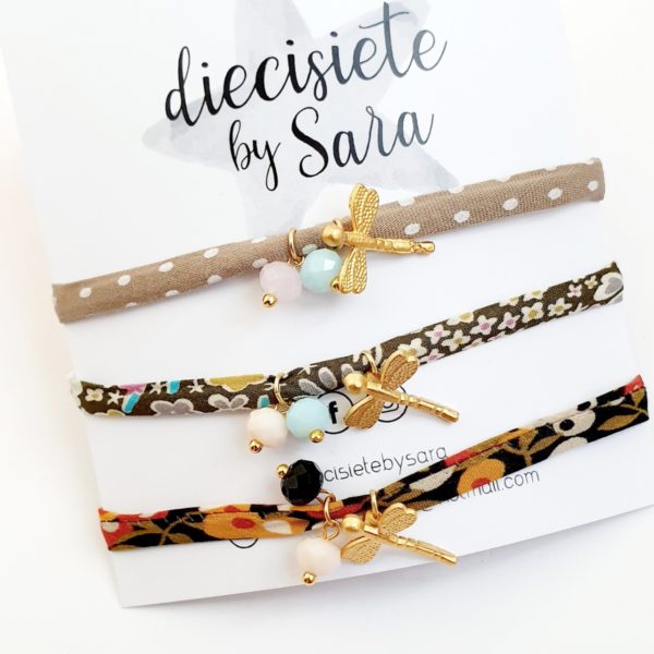 Pulsera tela seda con cierre ajustable y pieza de libelula en dorado con dos piedritas de color
