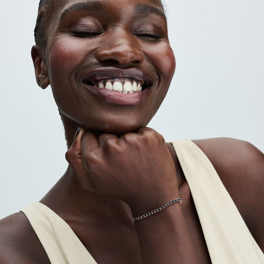 Dale un toque audaz a tu look con la Pulsera Tenis Negra Brillante. La pulsera, que se presenta con un recubrimiento en oro rosa de 14k, se ha embellecido con 48 cristales sintéticos de color negro engastados en garra en cestas abiertas cuadradas. El cierre ajustable con una gema colgante permite personalizar el ajuste. Ideal para combinar con otros colores y metales, esta pulsera introduce una llamativa gema de color negro en la colección Pandora Timeless. Experimenta la elegancia de la repetición y el contraste, y aumenta la profundidad de tu combinación de pulseras.