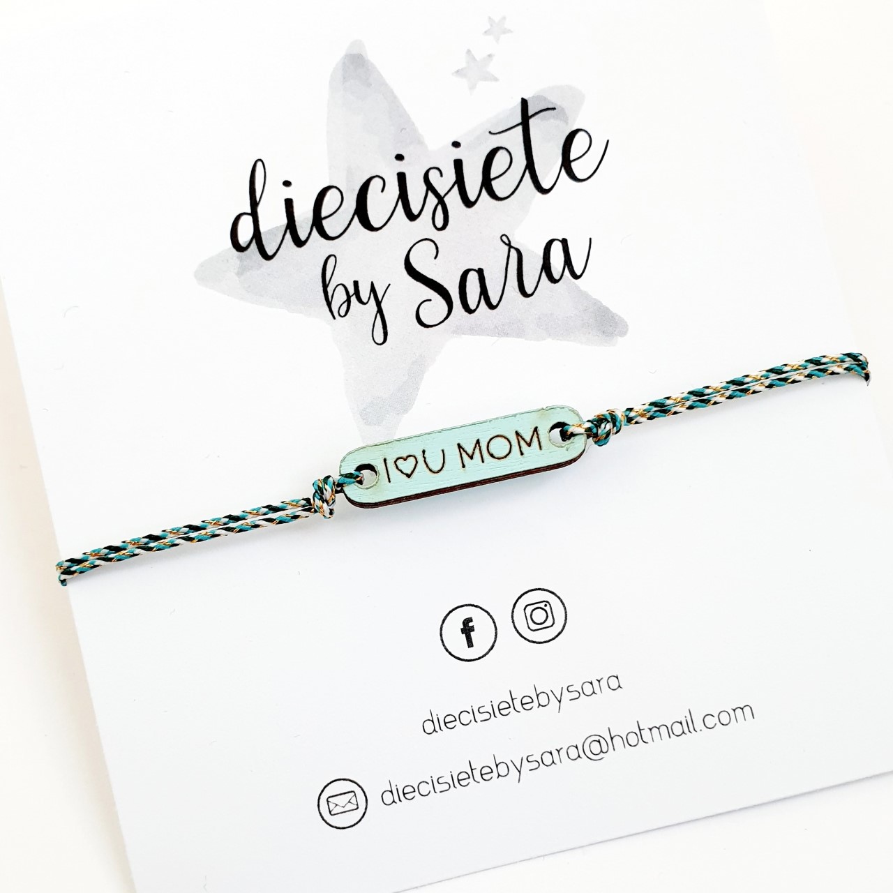 Pulsera de hilo ajustable con chapa grabada «I❤U MOM»