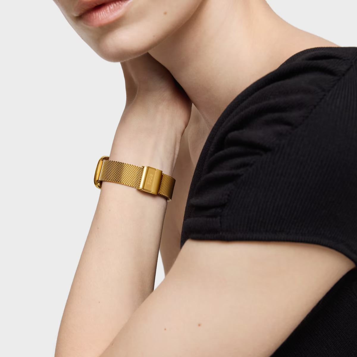 Reloj analógico TOUS T-Band Club con brazalete y caja de acero inoxidable dorado. Diámetro caja: 26,5 mm x 44 mm. Esfera: nácar. Funciones: hora y minutos. Impermeable: 3 ATM. Brazalete: 16mm x 16mm x 87mm / 16mm x 16mm x 110mm. Cierre ajustable con cierre de seguridad.