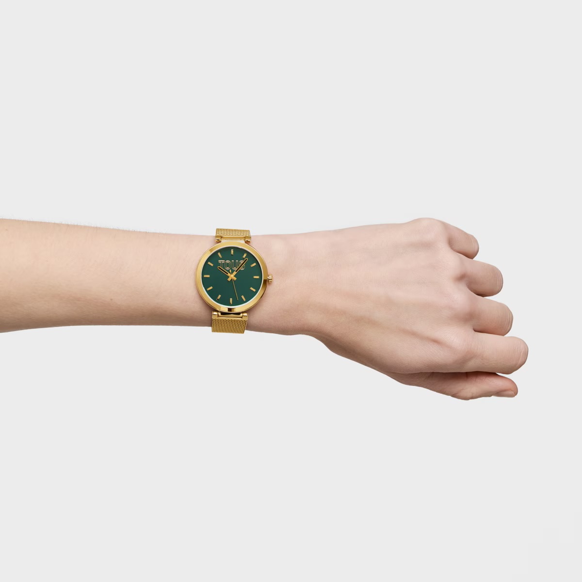 Reloj analógico TOUS S-Mesh Mirror con brazalete y caja de acero dorado. Diámetro caja: 36 mm. Esfera: con efecto espejo en color verde. Funciones: hora, minutos y segundos. Movimiento: analógico de cuarzo japonés. Impermeable: 5 ATM. Brazalete: 65mm x 18mm x 16mm / 105mm x 18mm x 16mm. Cierre de malla milanesa con cierre de seguridad.