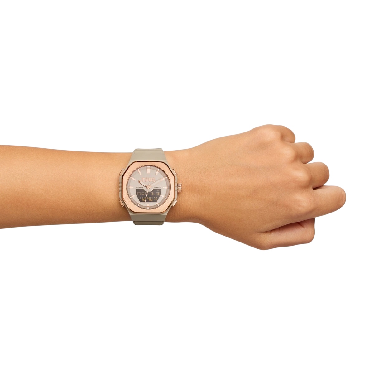 Reloj analógico/digital TOUS Bet de acero rosado y brazalete nylon endurecido en color topo. Esfera metálica con pantalla LCD con luz. Cristal mineral redondo plano. Diámetro: 42,5 mm x 49,5 mm. Funciones: hora, minutos segundos cronógrafo 1/100s, alarma, cuenta atrás, hora 12/24h, día, mes y día de la semana. Impermeable a 10 ATM. Movimiento analógico/digital. Cierre hebilla.
