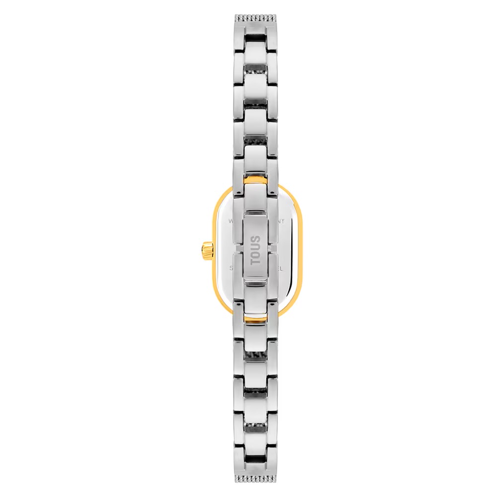 Reloj analógico joya TOUS Oval Icon con brazalete de acero inoxidable y acero dorado. Diámetro caja: 18 mm x 28,5 mm. Cristal mineral plano ovalado. Funciones: horas y minutos. Movimiento: analógico de cuarzo japonés. Impermeable: 3 ATM. Brazalete: 8mm x 8mm x 79mm / 8mm x 8mm x 82mm. Cierre con malla milanesa/eslabones ajustable.