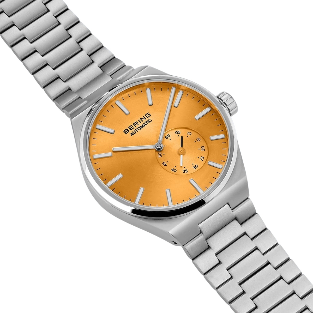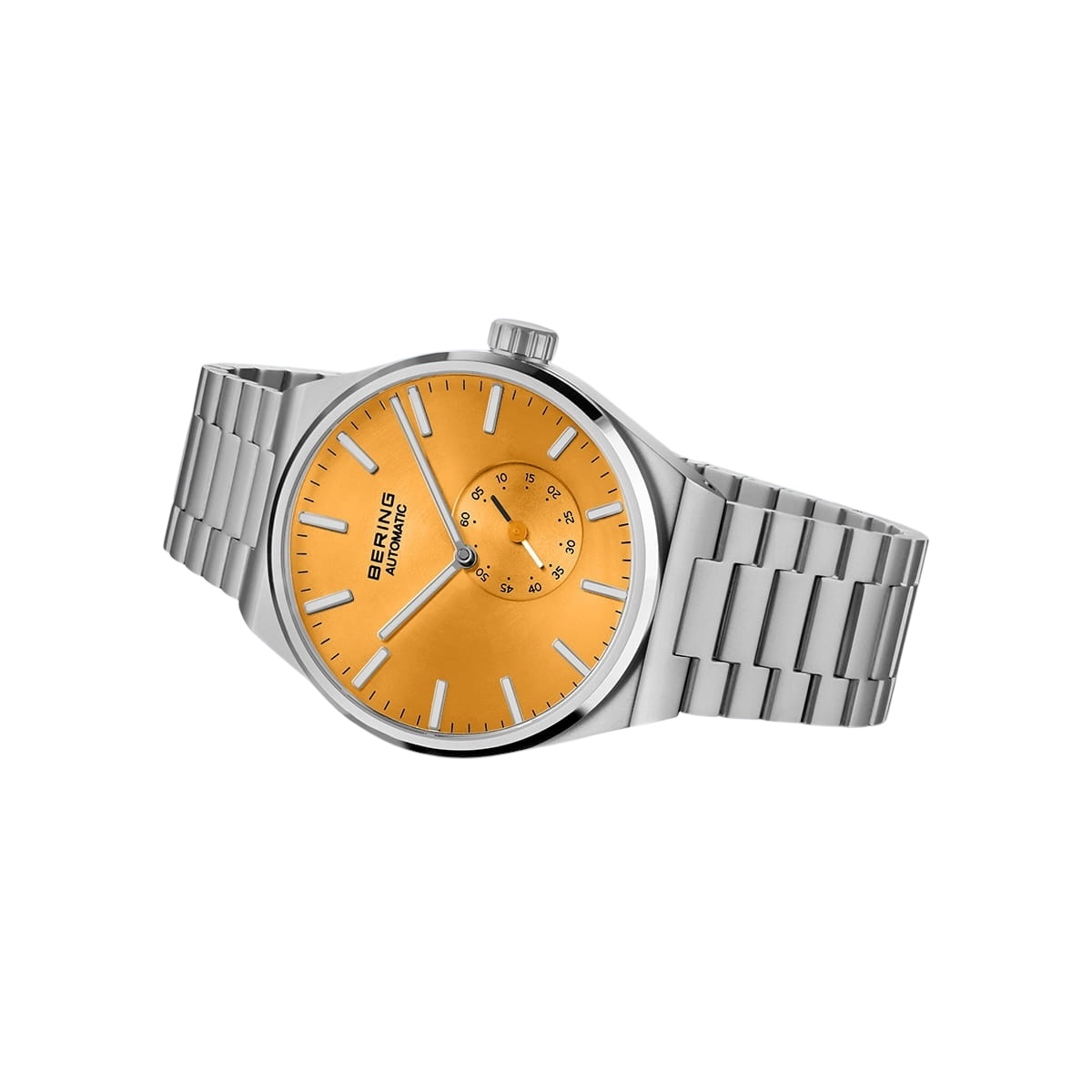 Imagina poder mover el tiempo como las olas mueven el mar, impulsándolo con un suave movimiento de tu brazo y transfiriéndole tu energía. El movimiento de tu brazo es suficiente y un rotor tensa el muelle en pequeños pasos, mientras que el llamado puente -un embrague deslizante- impide que este muelle tensor se enrolle en exceso. Siempre uniformemente tensado, garantiza un funcionamiento suave. Un movimiento de reloj tan complejo suele ocupar mucho espacio. No es el caso de BERING. El movimiento automático hace posible un diseño plano y combina las características típicas de BERING en una simbiosis perfecta y masculina: minimalismo danés, elegancia purista y belleza atemporal. Mirar la colorida esfera evoca recuerdos de las coloridas fachadas de las casas nórdicas de Groenlandia, que brillan con la misma inspiradora diversidad.