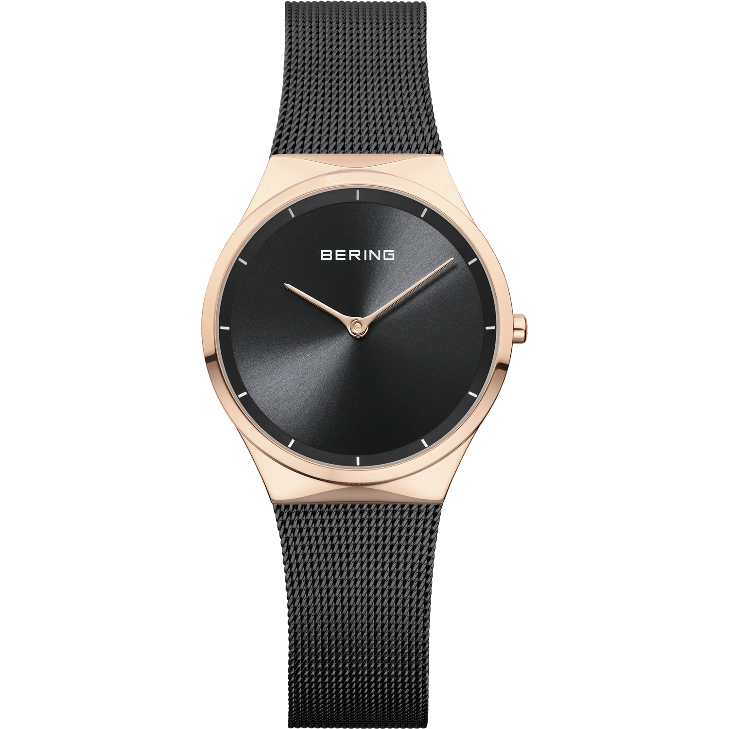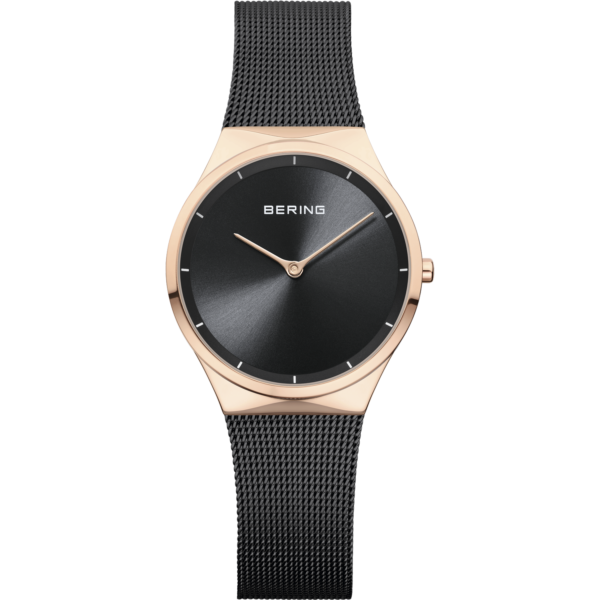 Reloj Negro de estilo minimalista con esfera negra sencilla e indicadores en las horas en punto. Caja de acero rose de 31 mm. Brazalete de malla milanesa con cierre autoajustable y cristal de zafiro resistente a las rayaduras.