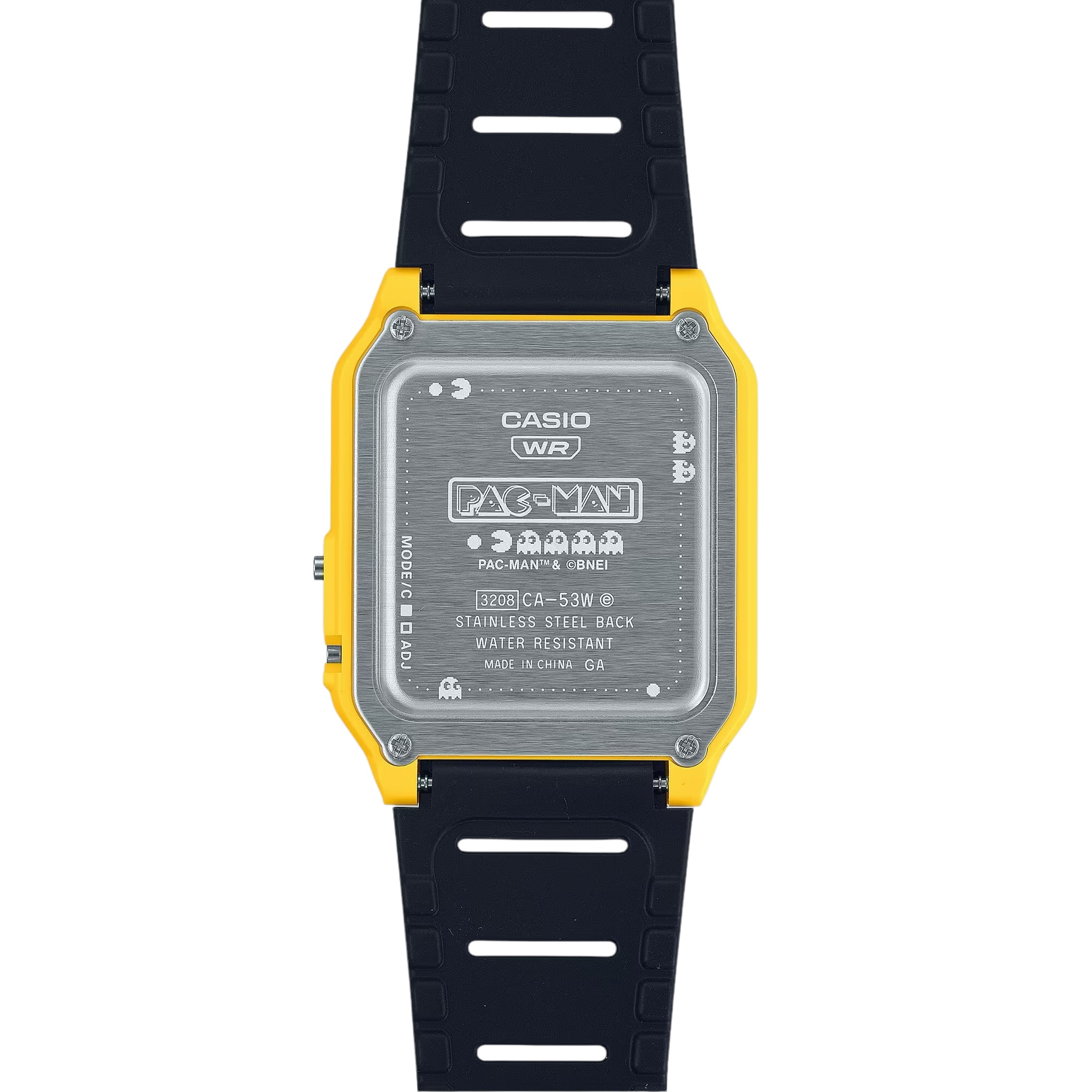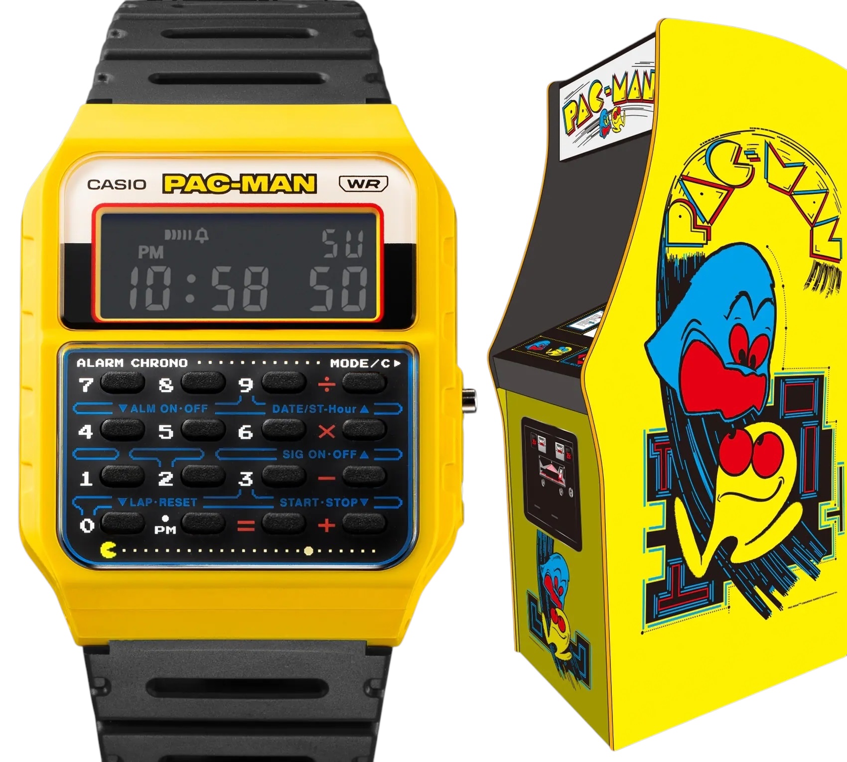 Presentamos toda una colección de colaboraciones especiales para celebrar este año los 50 años de relojes Casio y prepararte para el 45 aniversario de PAC-MAN del año que viene. Con diseños divertidos y un toque nostálgico, esta línea da vida al mundo de PAC-MAN, el popular juego de Namco Bandai Entertainment. La esfera del reloj está diseñada para evocar un escenario de juego con los personajes conocidos corriendo por el laberinto de la pantalla del juego, y está contorneada por un bisel amarillo para proyectar el aspecto de una máquina recreativa. El fondo de la caja lleva grabados los personajes y el logotipo de PAC-MAN. La correa está fabricada con resina de base biológica, un material que se espera que ayude a reducir el impacto medioambiental. Se presenta en un embalaje especial con un diseño de máquina recreativa.