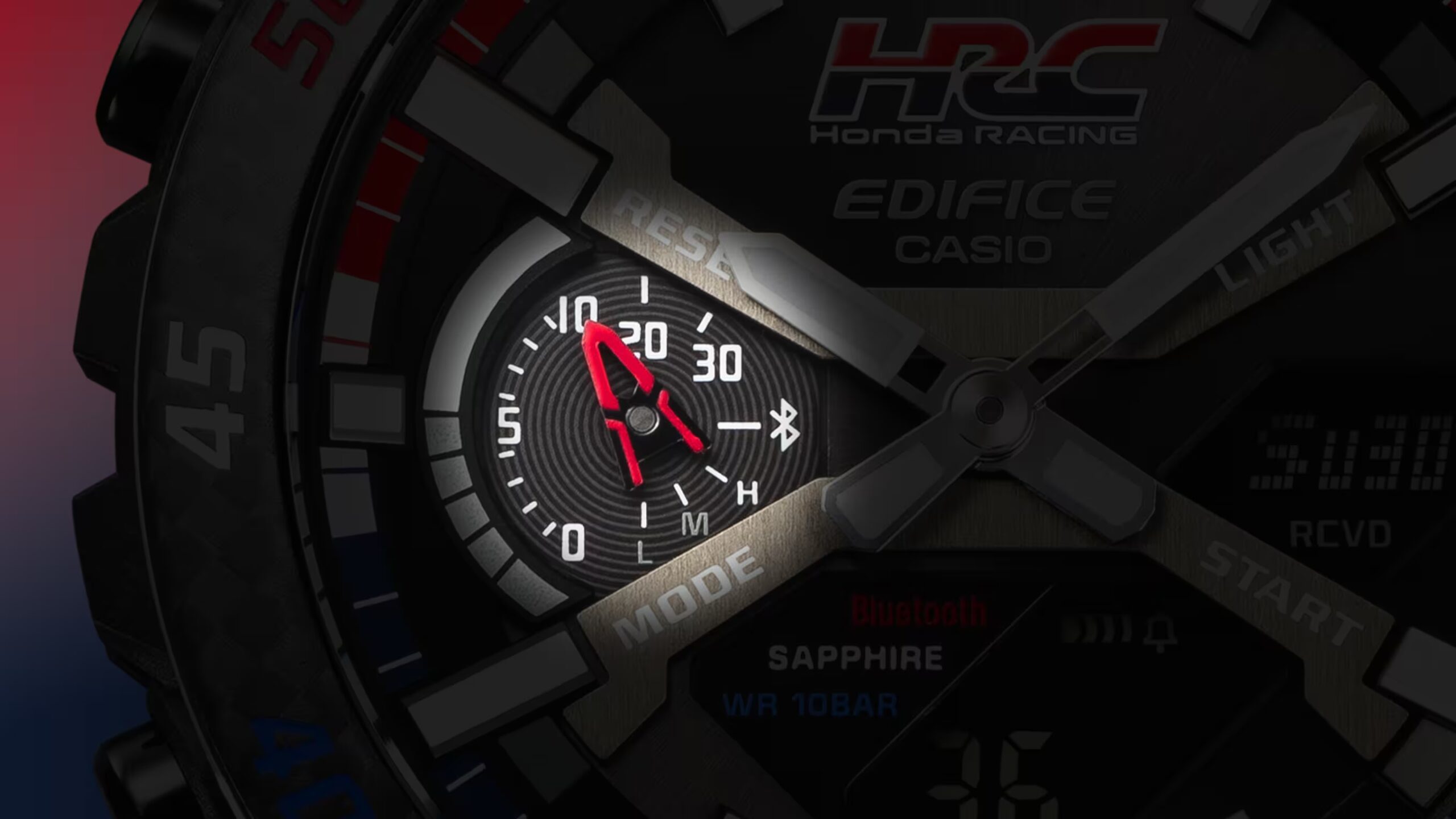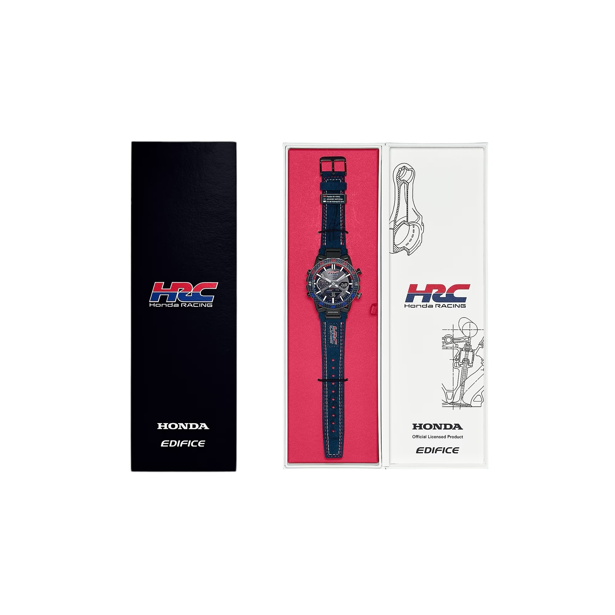 Siente la adrenalina del espíritu HRC (Honda Racing Corporation) en un EDIFICE de alto rendimiento, diseñado en rojo, azul y blanco, que encarna la velocidad y la inteligencia en cada carrera. Este reloj rinde homenaje a las impresionantes victorias de HRC en los circuitos más icónicos del mundo, con un diseño tricolor original creado bajo la supervisión de Honda. Los vibrantes tonos rojo, azul y blanco simbolizan el orgulloso espíritu competitivo de la marca, y cada color lleva un mensaje especial en la cinta: «»Pasión por la victoria»» en rojo, «»Tecnología avanzada»» en azul, y «»Para todos los aficionados al motor»» en blanco. Los colores se integran de manera armónica en todo el diseño, desde las marcas numéricas del bisel de carbono hasta las indicaciones de los minutos en el anillo de la esfera, así como en las funciones a los lados de la pantalla LCD, las costuras y la parte superior e inferior de la correa. La correa está confeccionada en Alcantara, y presenta características de diseño únicas, como una ilustración grabada con láser de una válvula y una biela de un motor de carreras Honda. Los logotipos de HRC y Honda adornan la esfera, la correa, el fondo de la caja y otros elementos, llevando el espíritu de competición de Honda directamente a tu muñeca. Basado en el EDIFICE SOSPENSIONE ECB-2000, este reloj utiliza materiales de carbono para el bisel y resina reforzada con fibra de carbono en la caja, inspirándose en el diseño de suspensión de cuatro brazos utilizado en coches de carreras. Sincronízalo con tu smartphone a través de Bluetooth® para ajustar automáticamente la hora con precisión. Con la aplicación, gestionar las múltiples funciones del reloj es muy sencillo. Además, su tecnología Tough Solar garantiza un rendimiento fiable en cualquier circunstancia. No te pierdas esta colaboración única, resultado de la creatividad de HRC y Casio en HRD Sakura, el centro de Honda dedicado a las carreras de coches. HRC (Honda Racing Corporation) HRC lidera las actividades de competición que son el corazón del ADN de Honda. La colaboración entre EDIFICE y HRC, ambas con raíces en Japón, ha evolucionado desde 2018 a partir de un compromiso compartido por aprovechar la alta tecnología en sus metas globales.